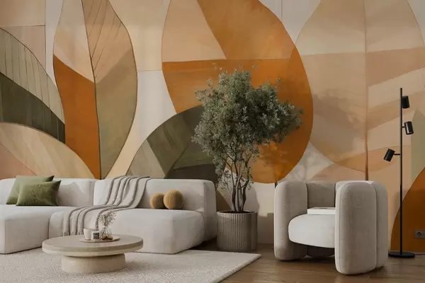 Zidne murale Apstraktno veliko lišće u nijansama narančaste, smeđe i zelene, teksturirano, raspoređeno na svijetloj pozadini br. w09539