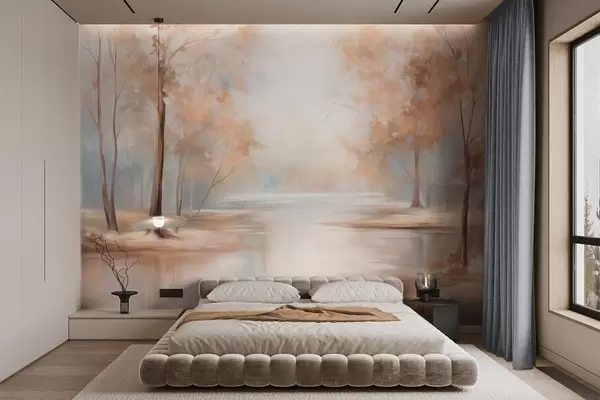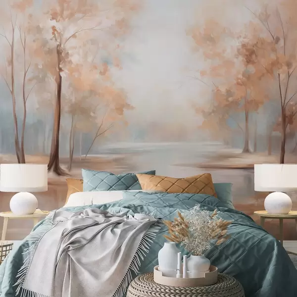 Zidne murale Jesenski teksturirani krajolik s drvećem i rijekom, meke boje, svijetla i prozračna atmosfera, miran i spokojan prizor br. w09541