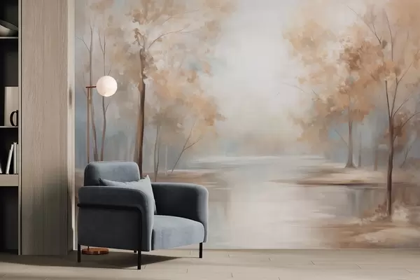 Zidne murale Jesenski teksturirani krajolik s drvećem i rijekom, meke boje, svijetla i prozračna atmosfera, miran i spokojan prizor br. w09541