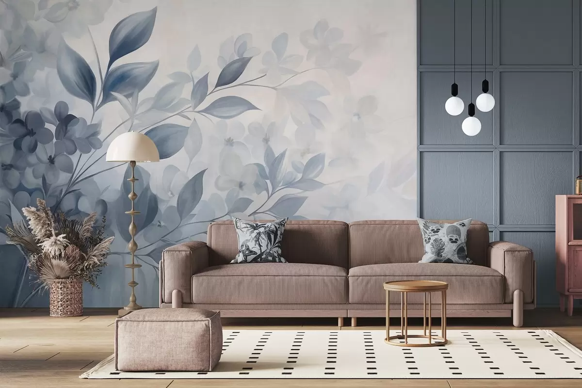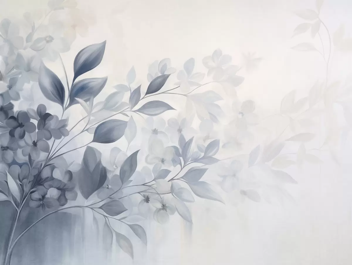 Zidne murale Teksturirana plavo-bijela grana s cvijećem i lišćem koje se stapaju u svijetlu pozadinu u stilu akvarela br. w09543