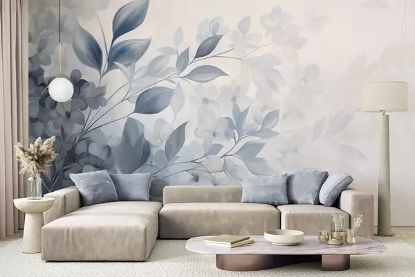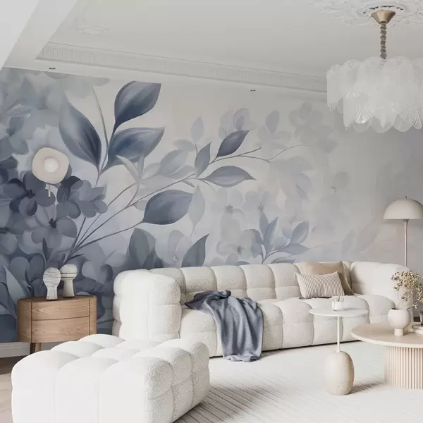 Zidne murale Teksturirana plavo-bijela grana s cvijećem i lišćem koje se stapaju u svijetlu pozadinu u stilu akvarela br. w09543