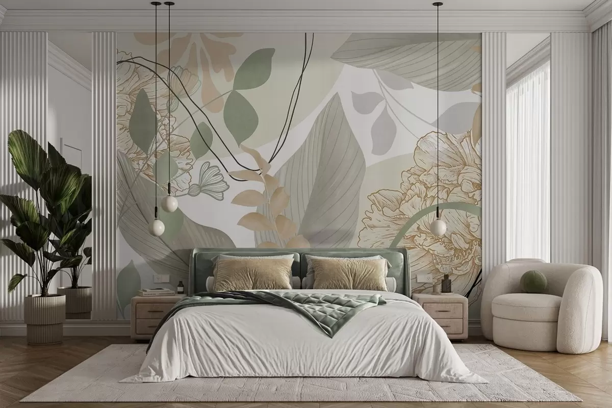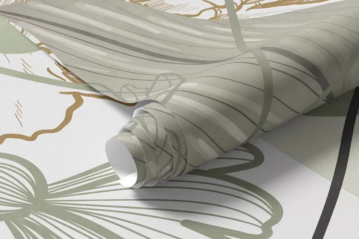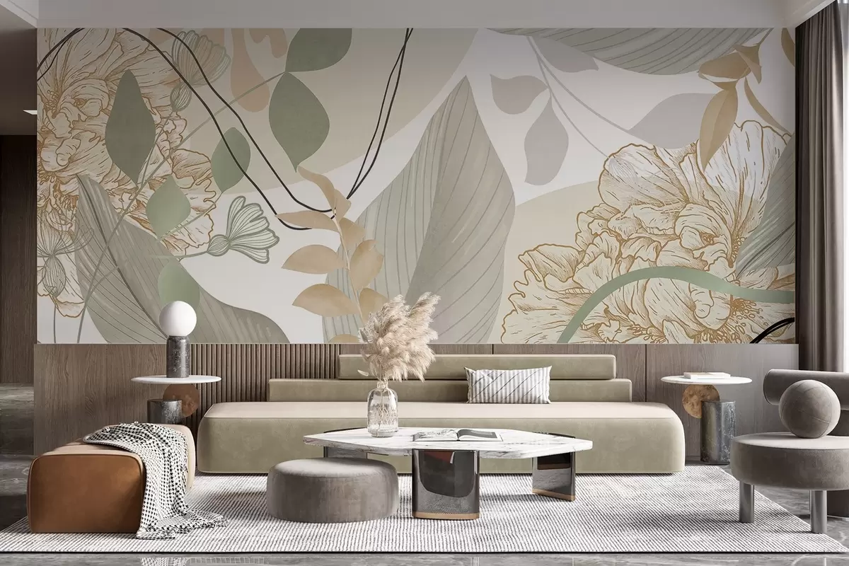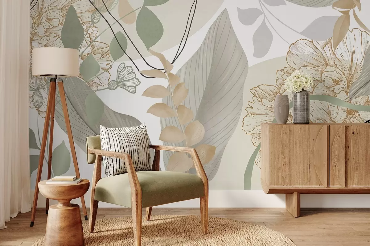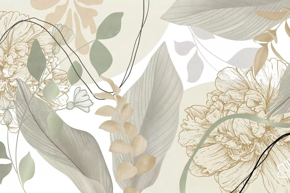 Zidne murale Apstraktni cvjetni print s velikim listovima u nijansama prigušene zelene i žute s tankim crnim linijama i bijelim cvjetnim obrisima br. w09544v2