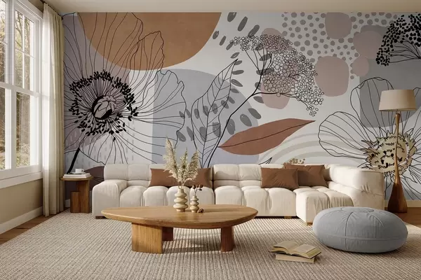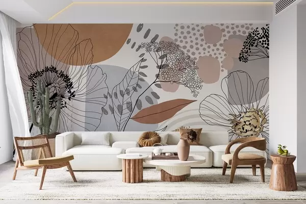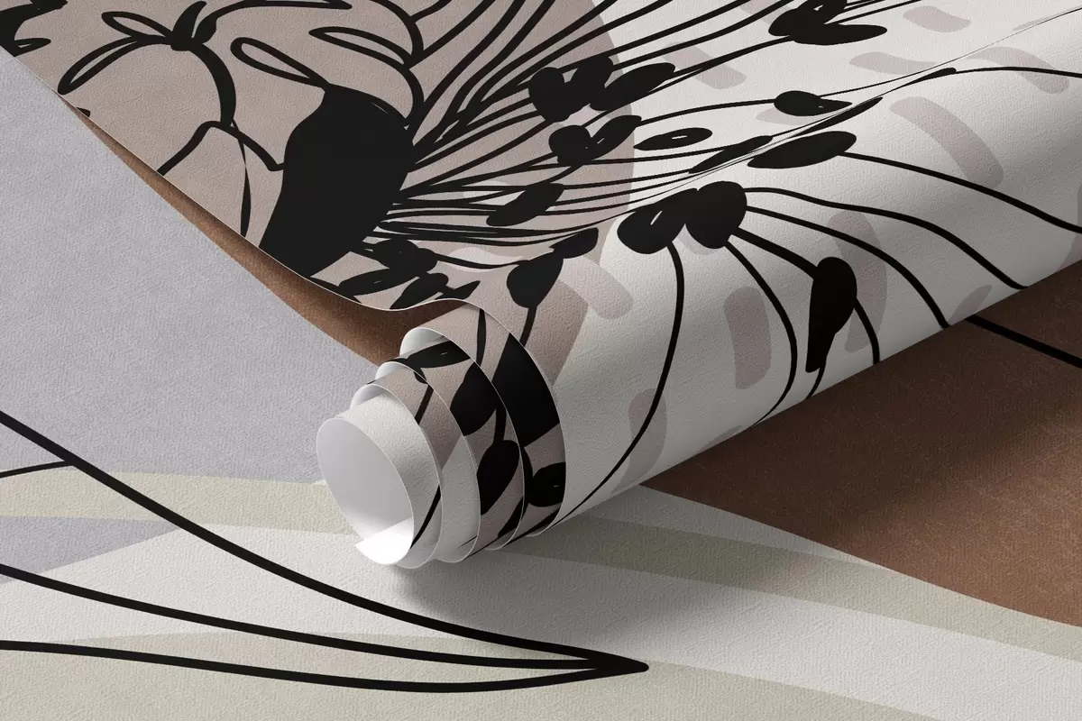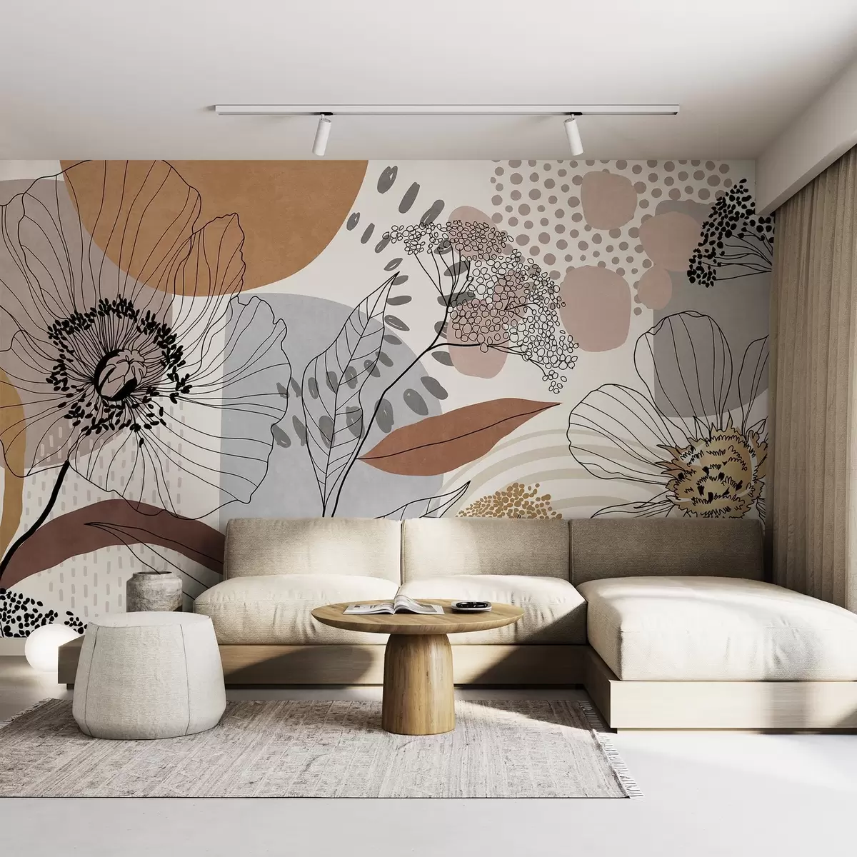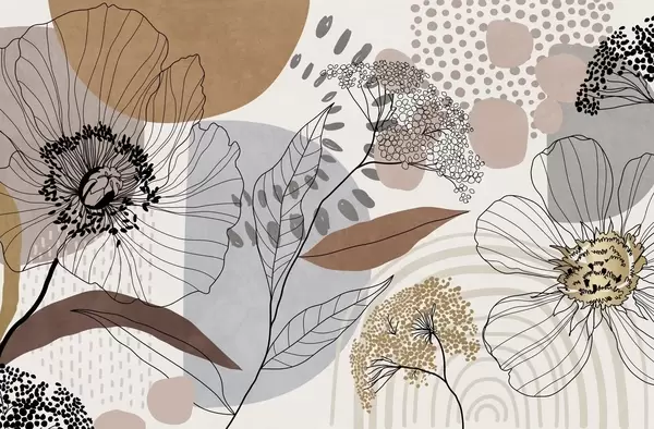 Zidne murale Apstraktni cvjetni teksturirani print s linijskom umjetnošću cvijeća, lišća i organskih oblika u prigušenim smeđim, bež i sivim tonovima br. w09548