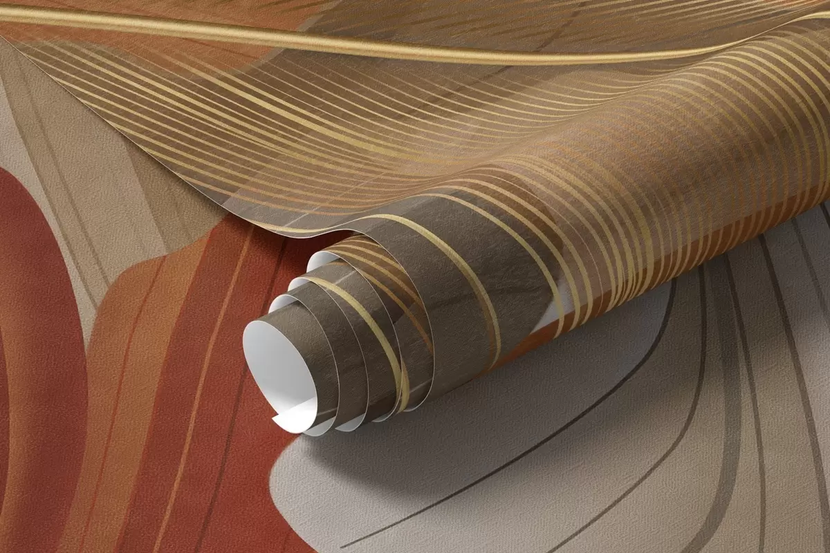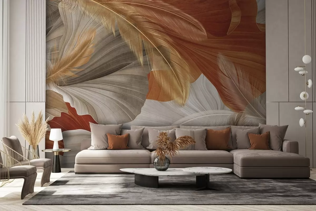zidne murale Apstraktni teksturirani veliki tekući oblici u krem i hrđavim bojama s nježnim, žutim, bež i smeđim perjem w09549