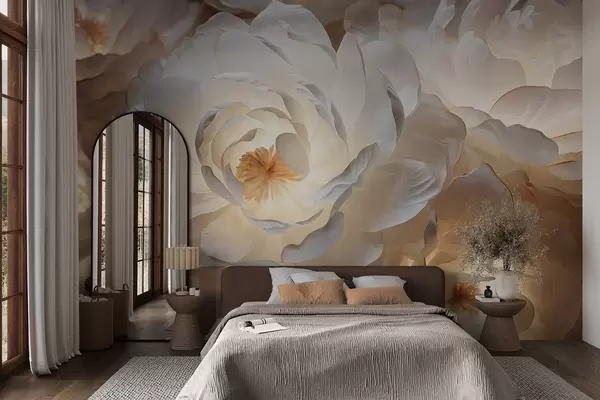 Zidne murale Veliki, bijeli fantastični cvjetovi božura sa žutim središtima, mekim osvjetljenjem i nježnim, teksturiranim slojevitim laticama br. w09550