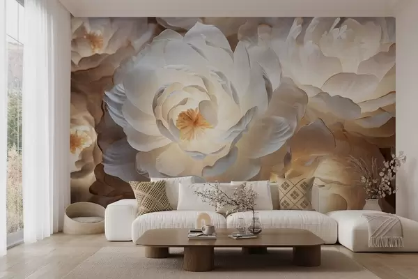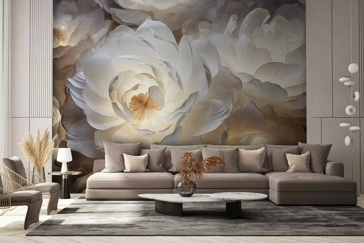 Zidne murale Veliki, bijeli fantastični cvjetovi božura sa žutim središtima, mekim osvjetljenjem i nježnim, teksturiranim slojevitim laticama br. w09550