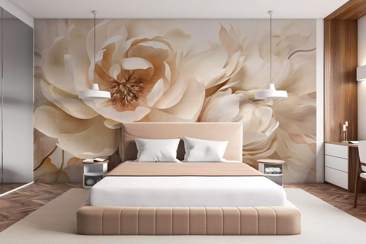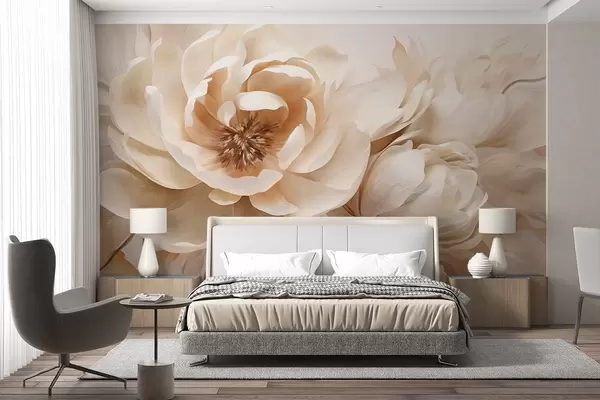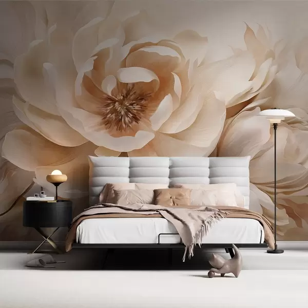 Zidne murale Kremasti teksturirani božuri sa smeđim središtima i listovima na zamućenoj svijetloj apstraktnoj pozadini br. w09554