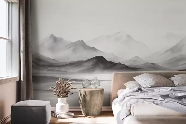 Zidne murale Monokromatski teksturirani krajolik s maglovitim planinama i jezerom u prvom planu br. w09555