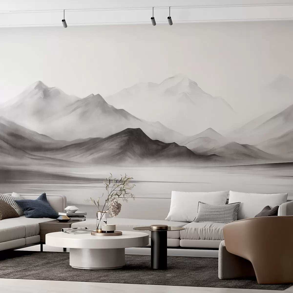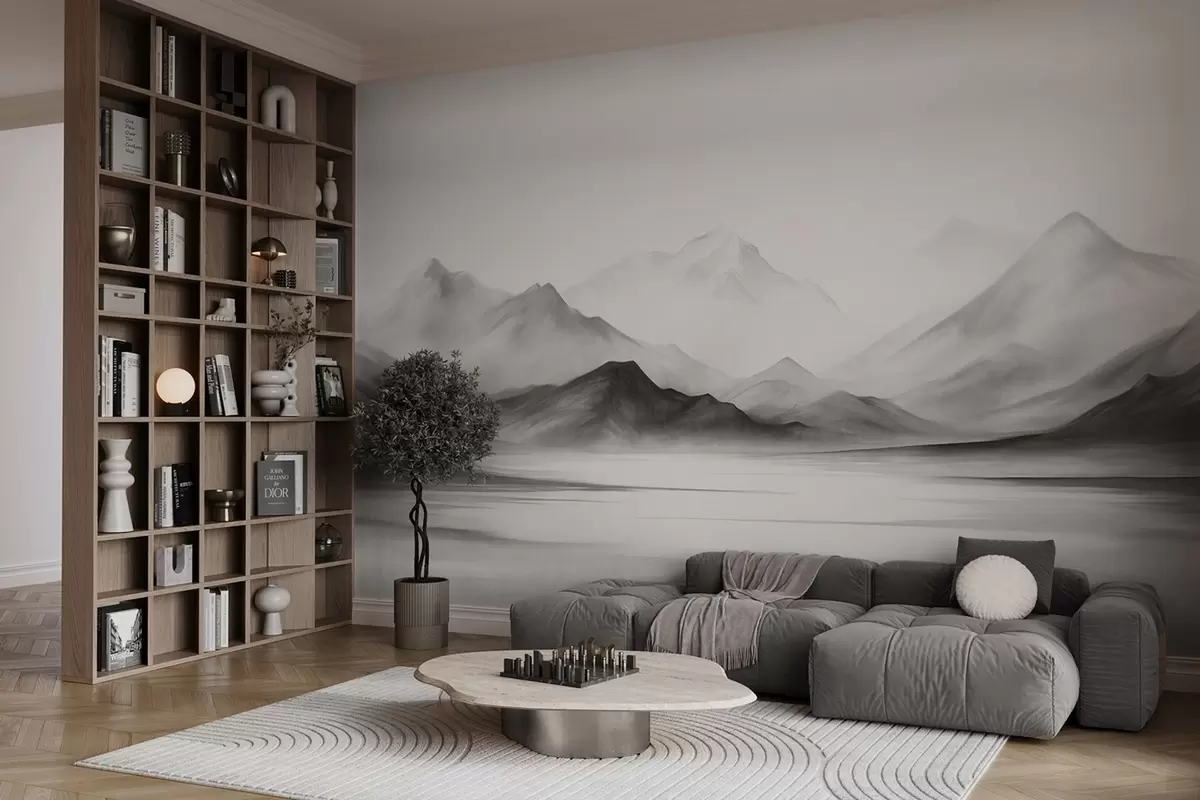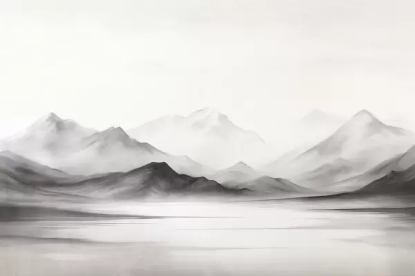 Zidne murale Monokromatski teksturirani krajolik s maglovitim planinama i jezerom u prvom planu br. w09555