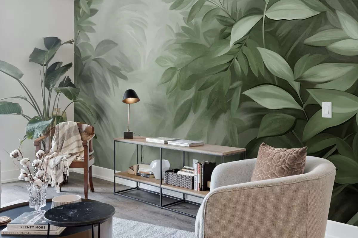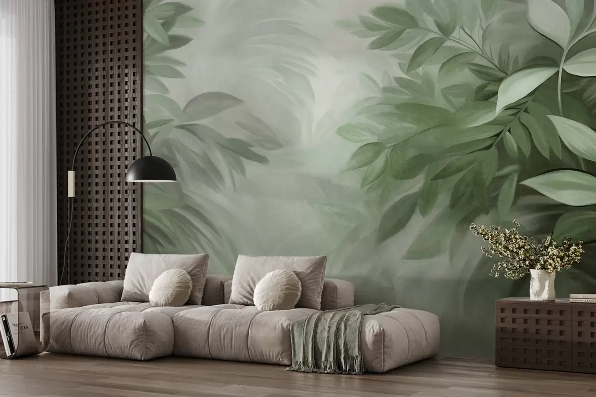 Zidne murale Zeleno i sivo lišće s mekim, mutnim teksturiranim lišćem, u slikarskom stilu s vidljivim potezima kista br. w09584v1
