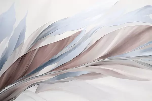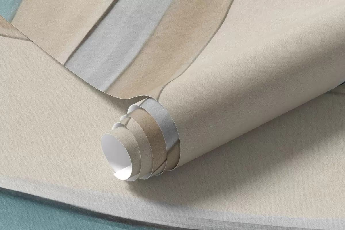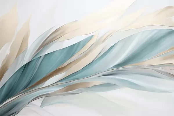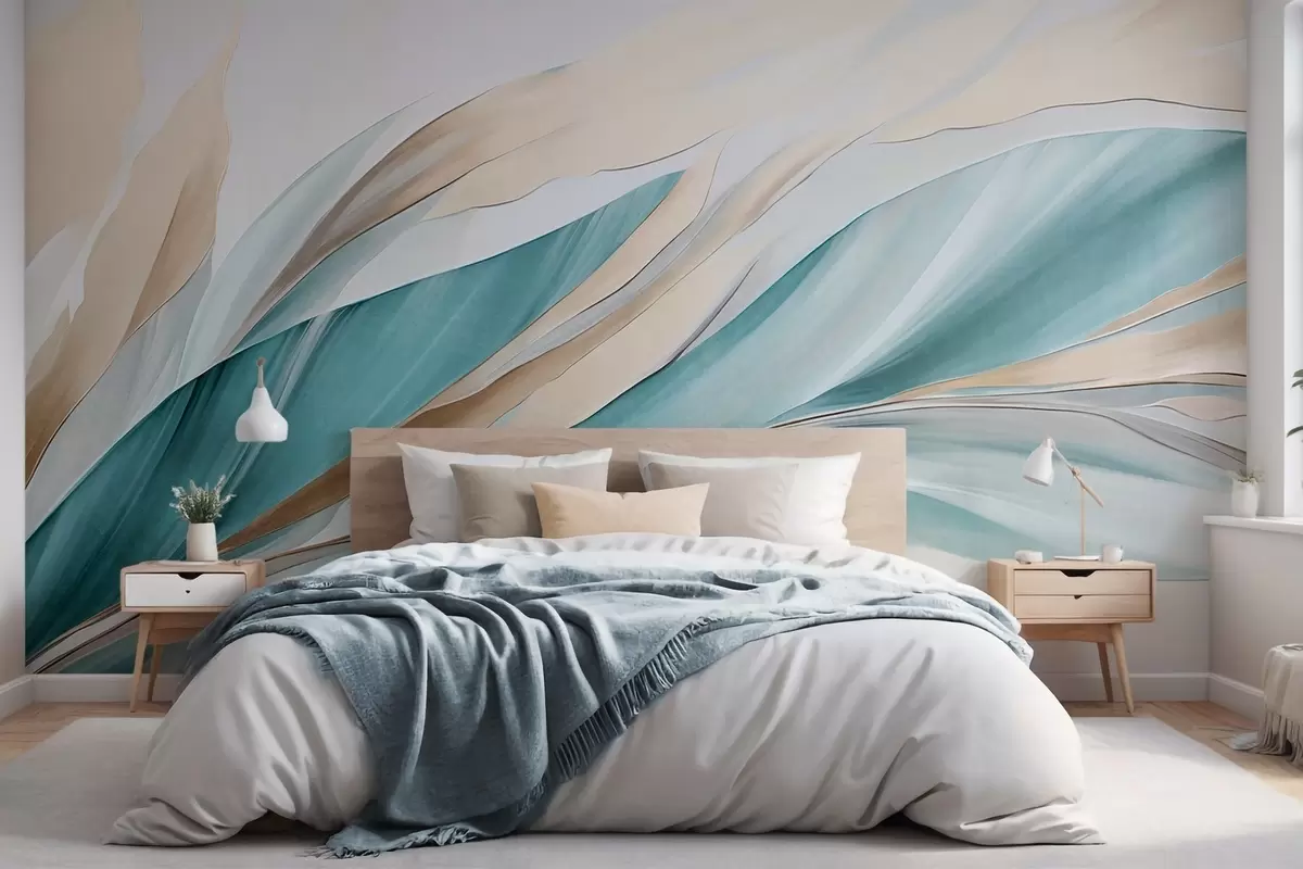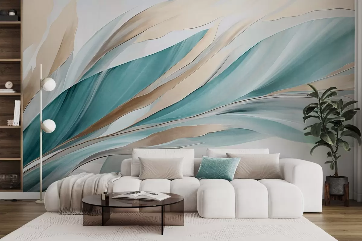 Zidne murale Apstraktni tekući valovi tirkizne i žute boje, s tankim oblicima i linijama, na bijeloj pozadini, teksturirana umjetnost br. w09585