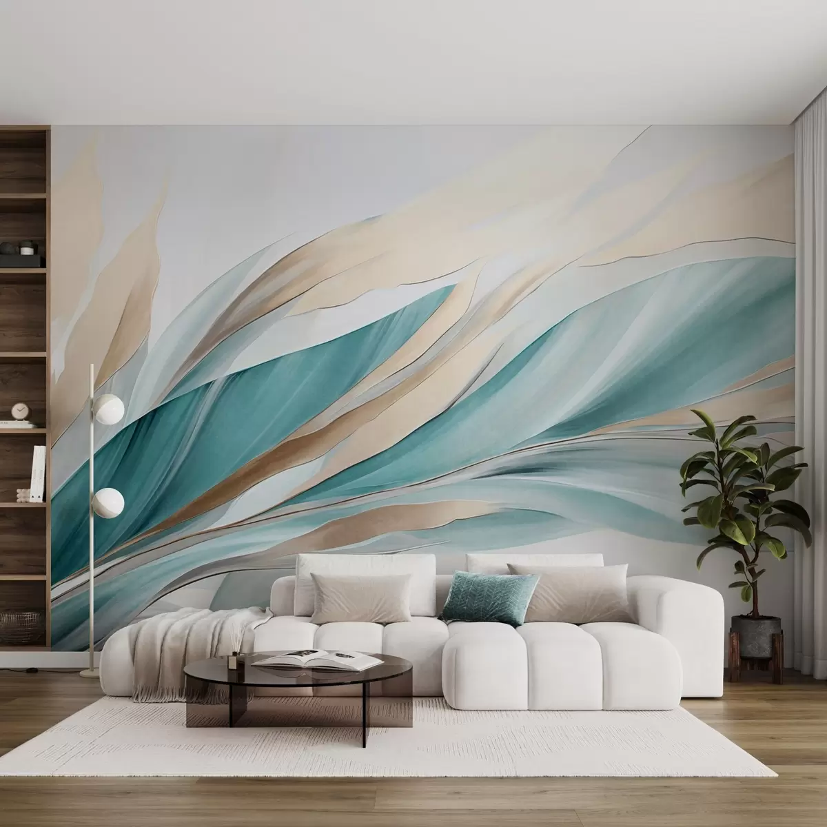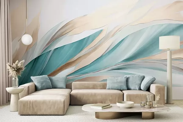Zidne murale Apstraktni tekući valovi tirkizne i žute boje, s tankim oblicima i linijama, na bijeloj pozadini, teksturirana umjetnost br. w09585