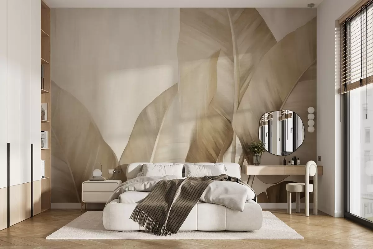Zidne murale Teksturirani veliki, svijetlosmeđi listovi banane na svijetlo bež pozadini, s mekom i minimalističkom estetikom br. w09586