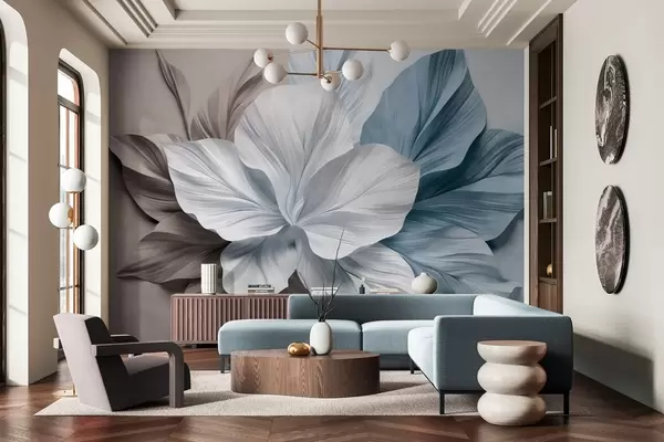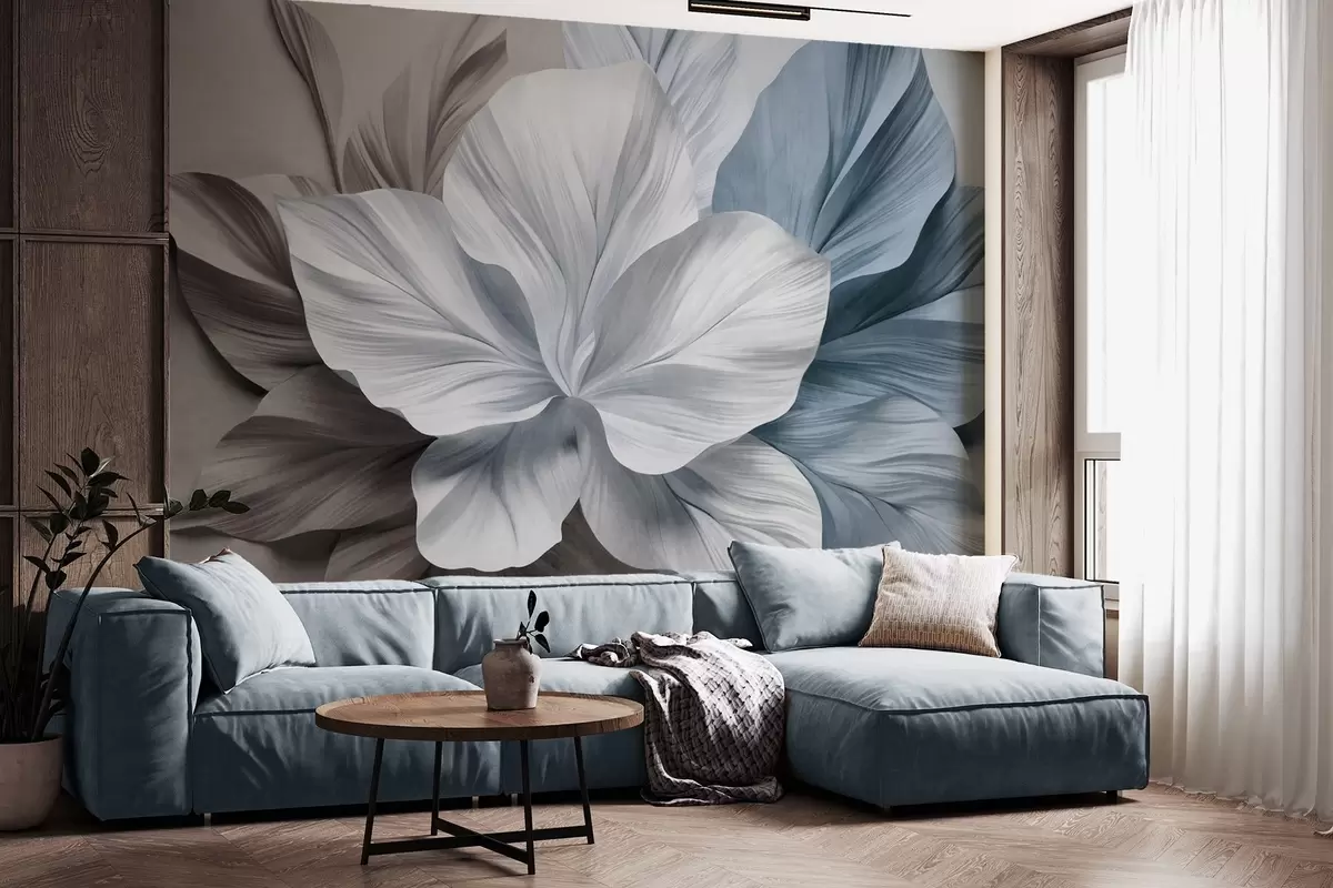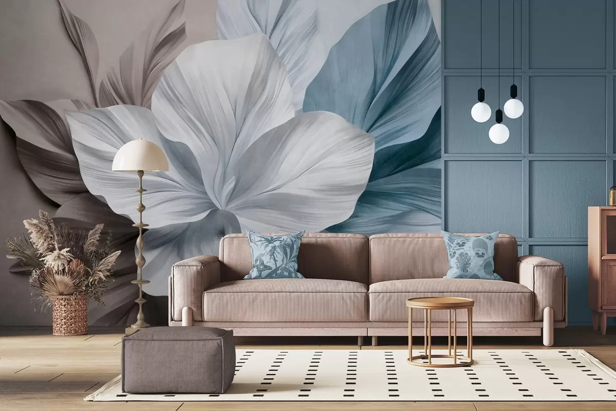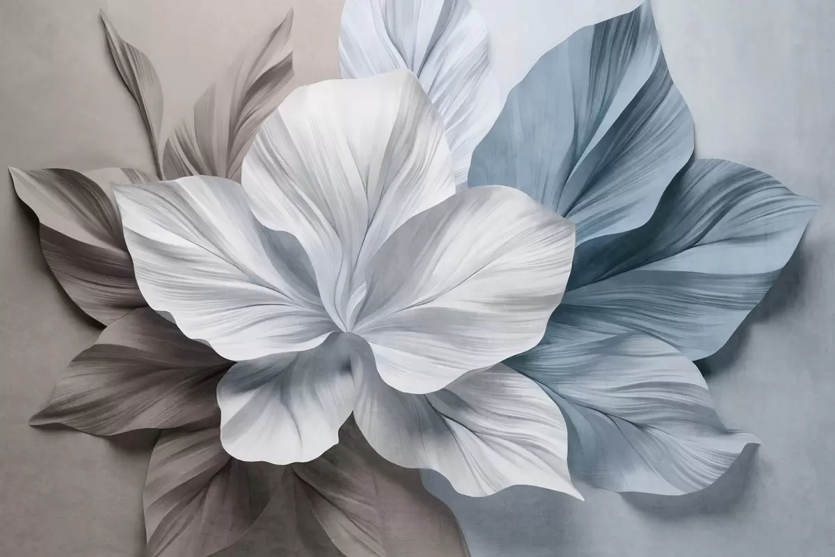 Zidne murale Apstraktni cvijet s više latica i teksturiranim listovima u nijansama smeđe i plave, mekana pozadina br. w09604v1