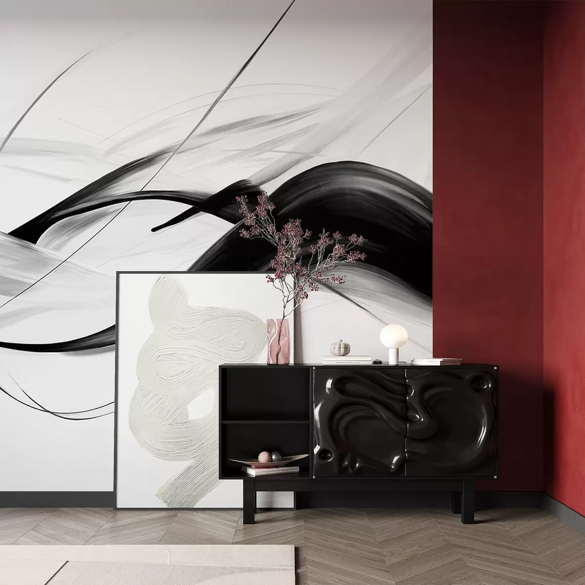 Zidne murale Apstraktni crno-bijeli potezi kistom s tankim linijama stvaraju moderan dizajn na svijetloj pozadini br. w09605