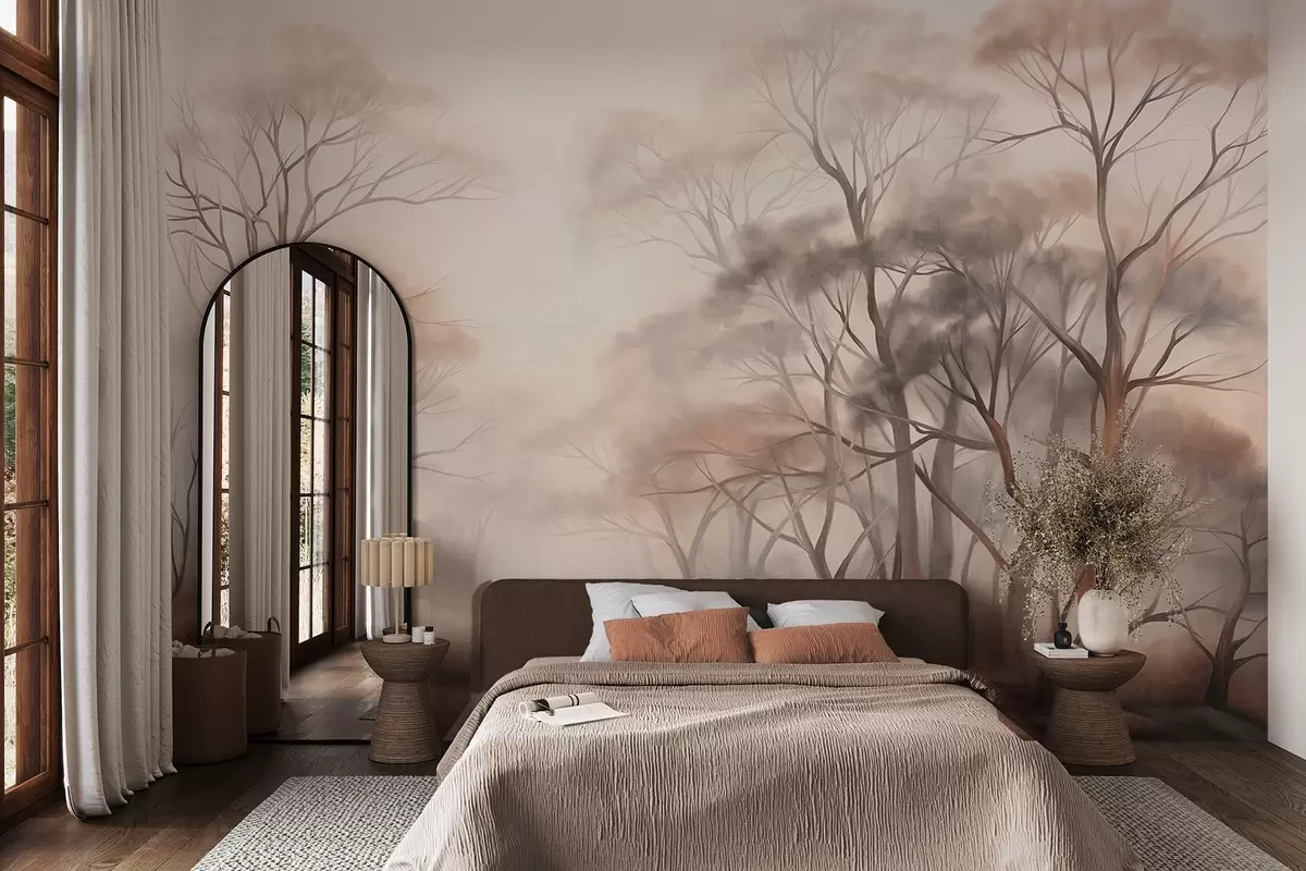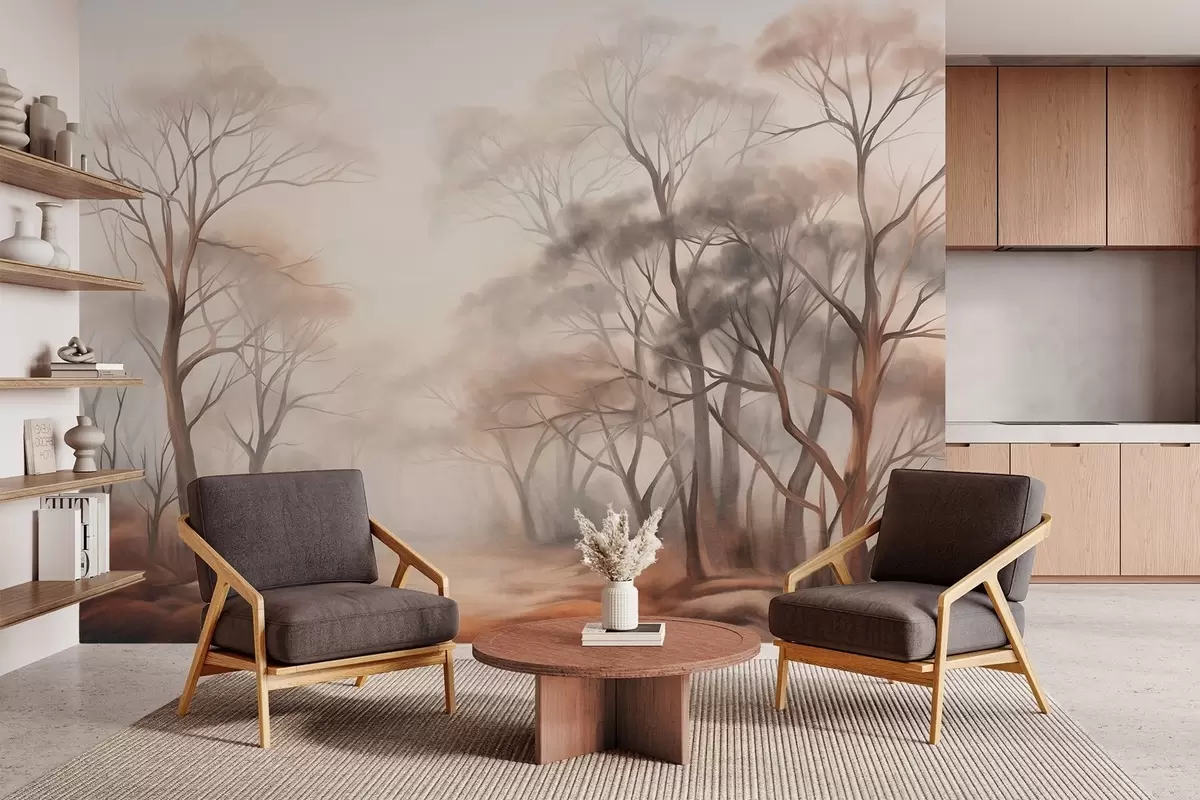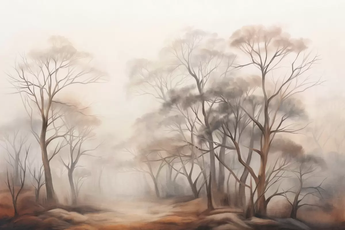 Zidne murale Teksturirano drveće u maglovitoj šumi, magloviti krajolik s prigušenim bojama i blagim osvjetljenjem br. w09609