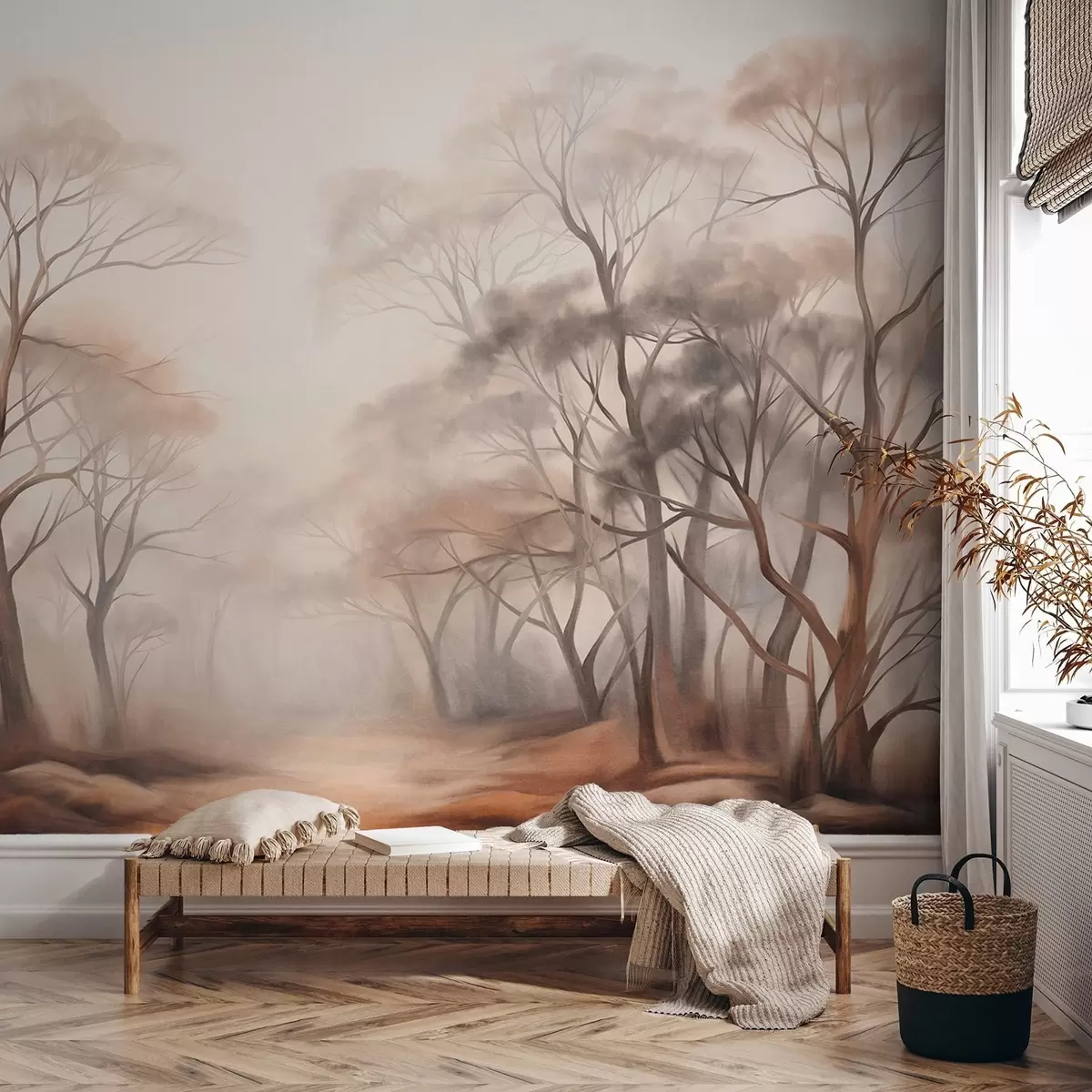Zidne murale Teksturirano drveće u maglovitoj šumi, magloviti krajolik s prigušenim bojama i blagim osvjetljenjem br. w09609