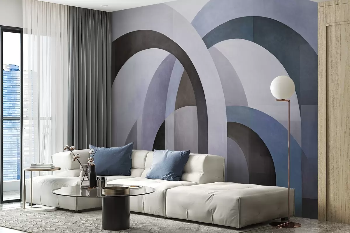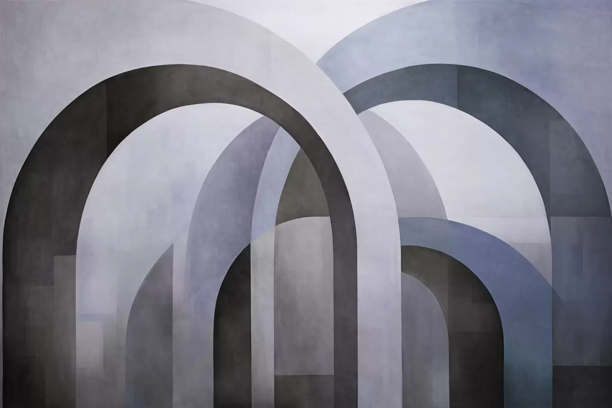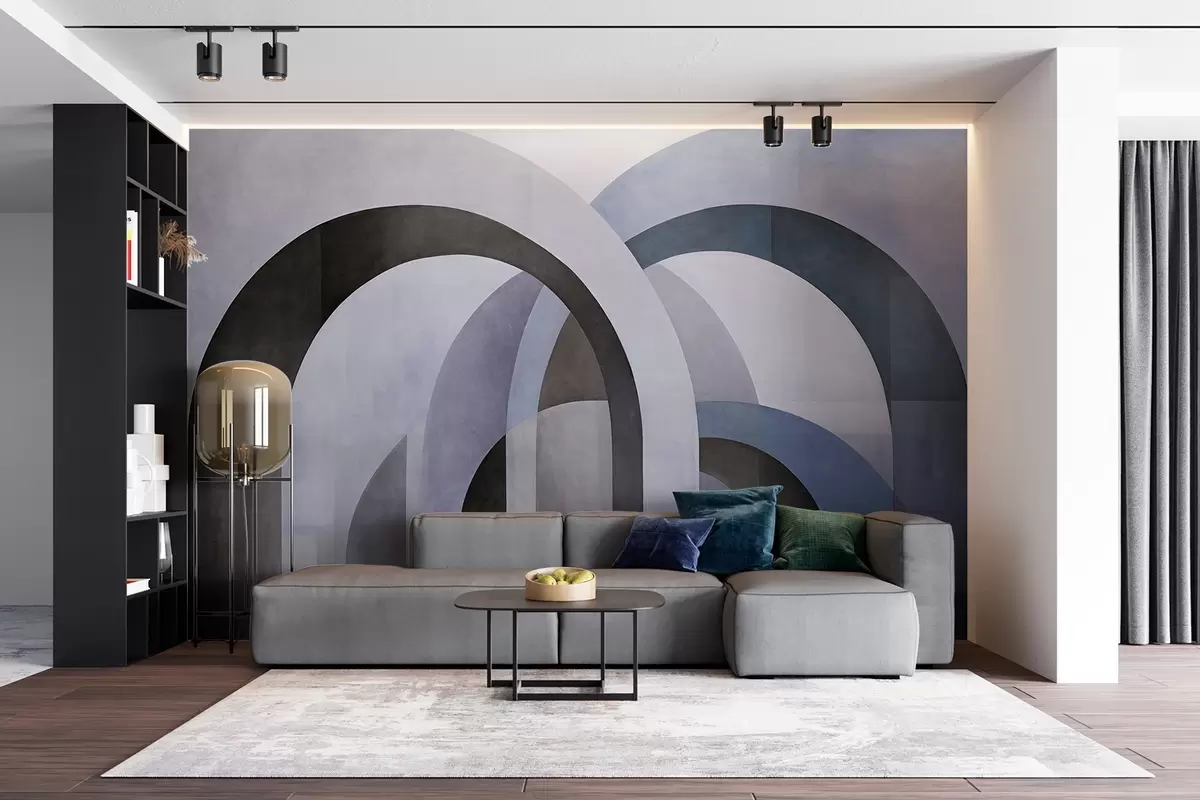 Zidne murale Apstraktni teksturirani geometrijski lukovi u tonovima plave, crne i sive, slojeviti moderni arhitektonski dizajn br. w09611v1