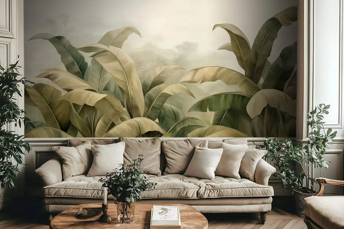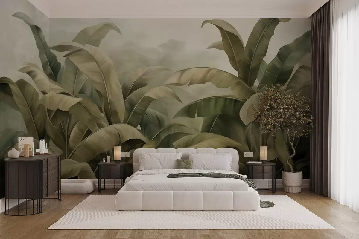 Zidne murale Teksturirani gusti džunglasti krajolik s velikim listovima banane u prigušenim zelenim i bež tonovima br. w09613