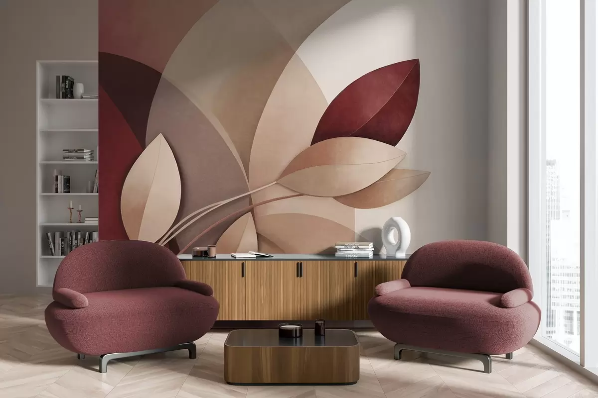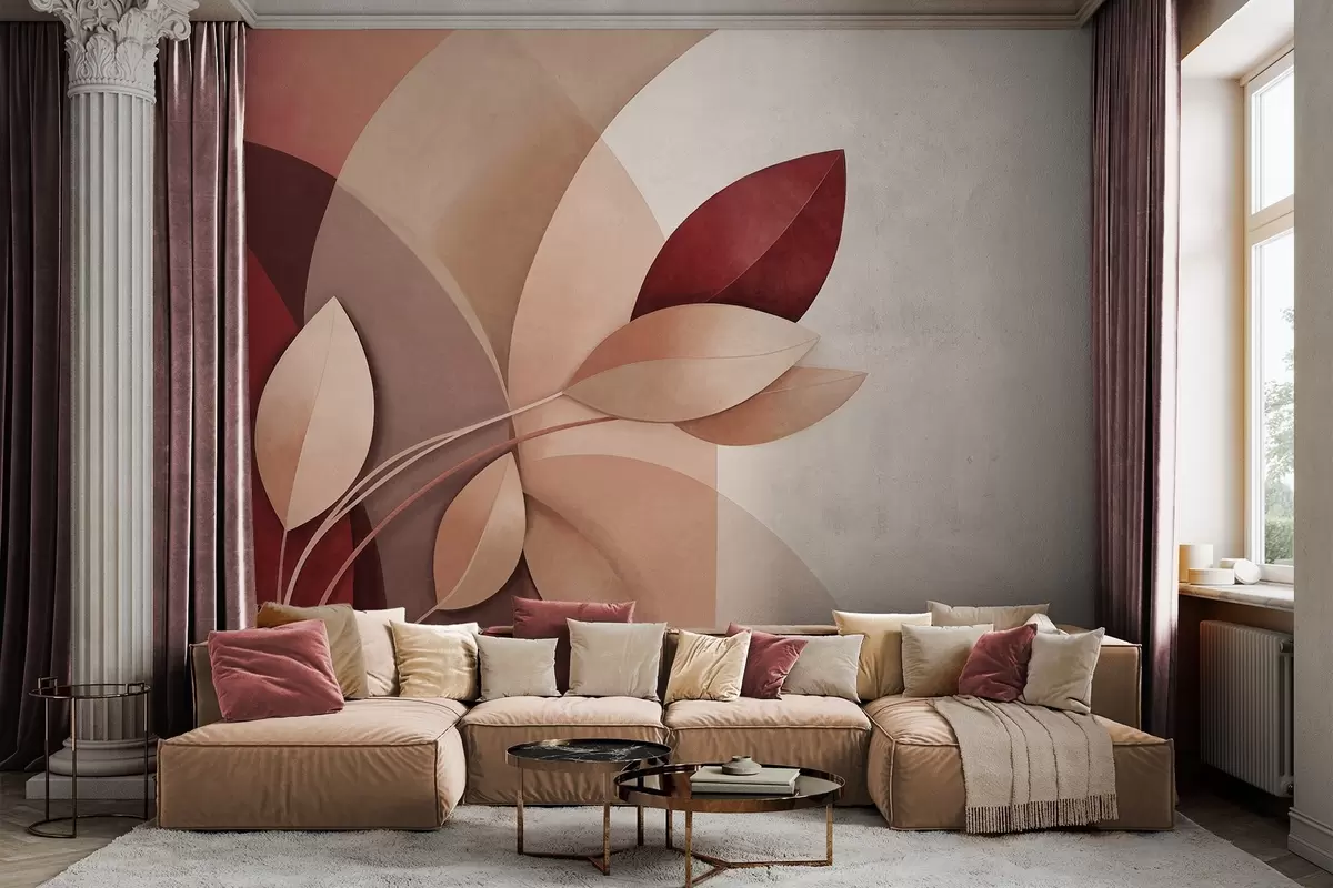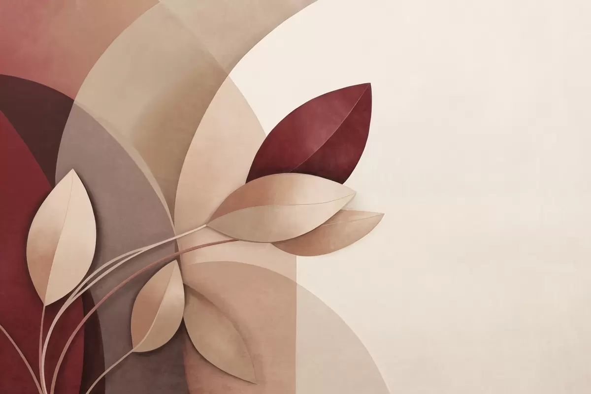 Zidne murale Apstraktna teksturirana grana s lišćem u nijansama smeđe, bež i crvene, na pozadini apstraktnih oblika br. w09618