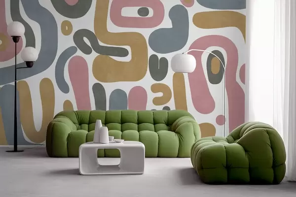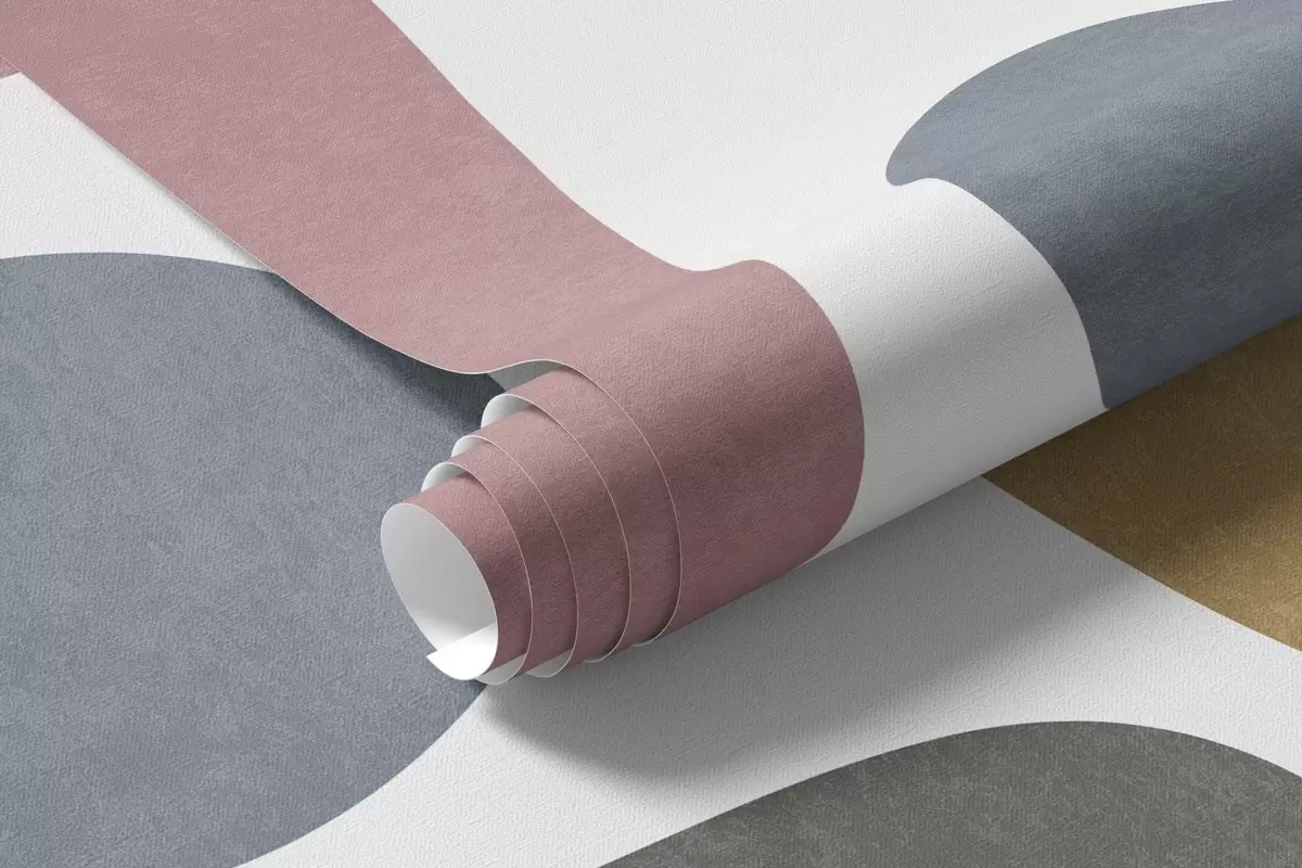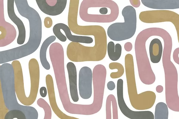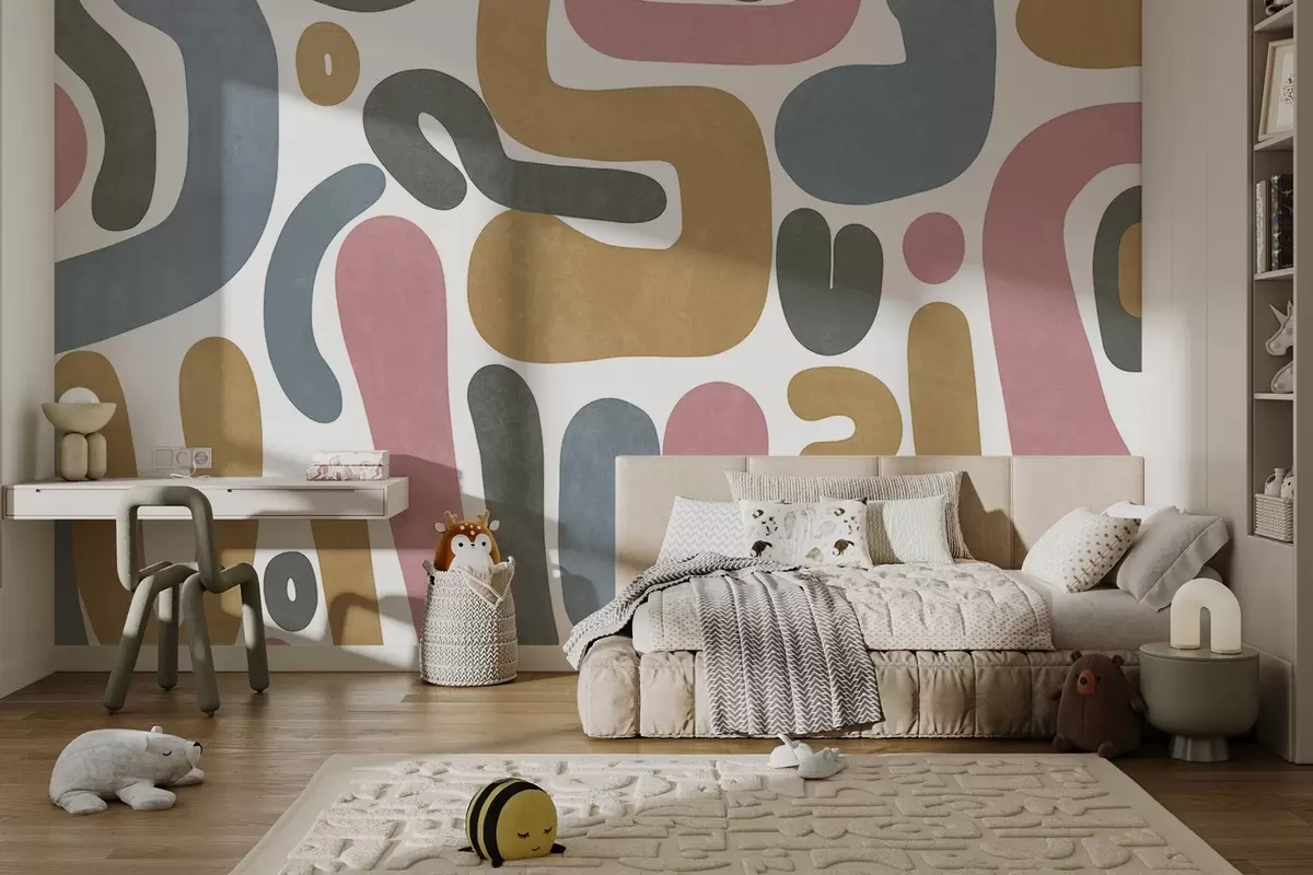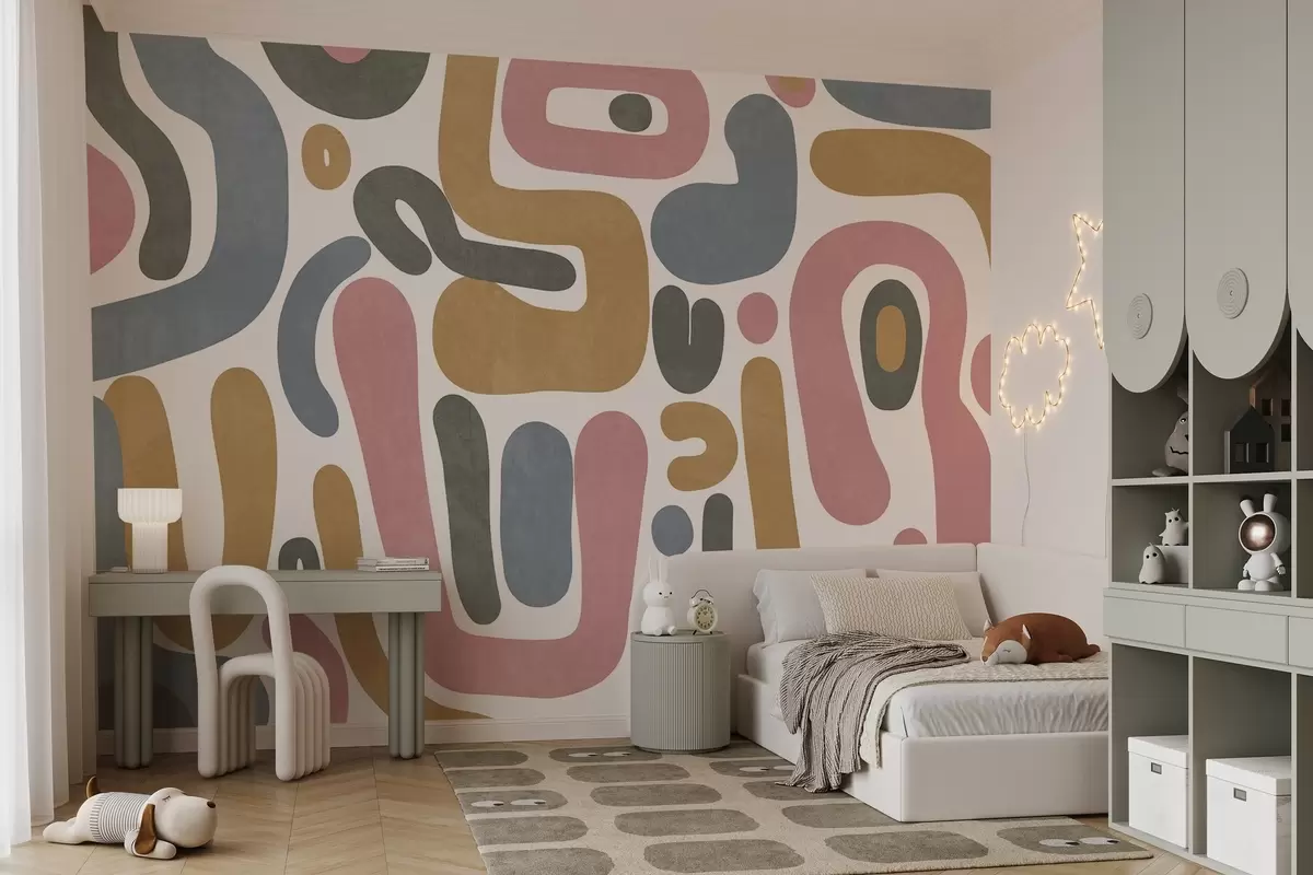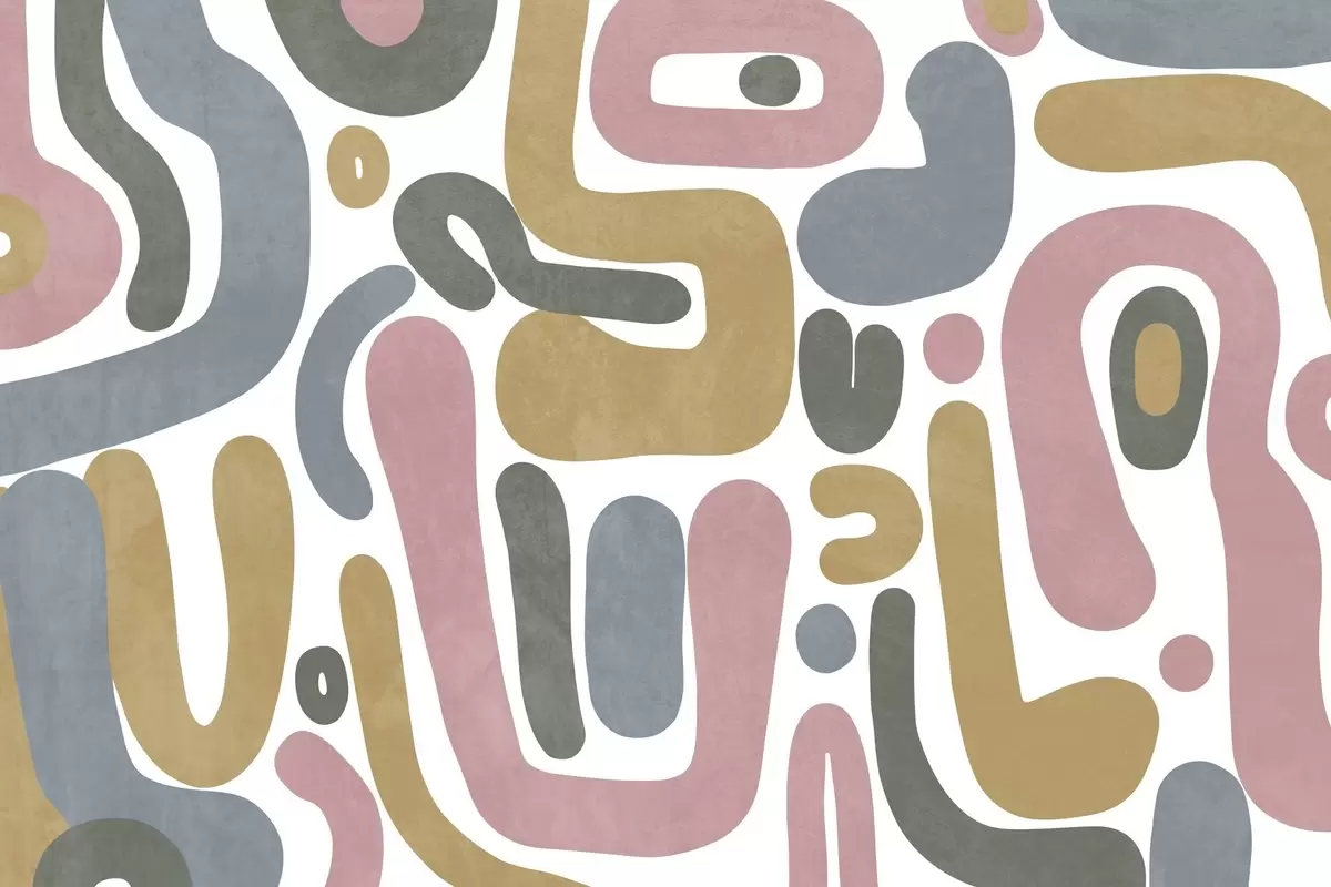 Zidne murale Apstraktni teksturirani oblici u pastelno ružičastoj, prigušeno plavoj, senf žutoj i sivoj boji na bijeloj pozadini moderne umjetnosti br. w09620