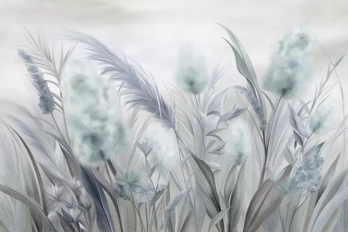 Zidne murale Plava i siva pampas trava i ostalo suho cvijeće s mekim, maglovitim nebom u pozadini br. w09635v1
