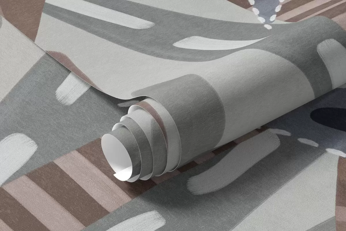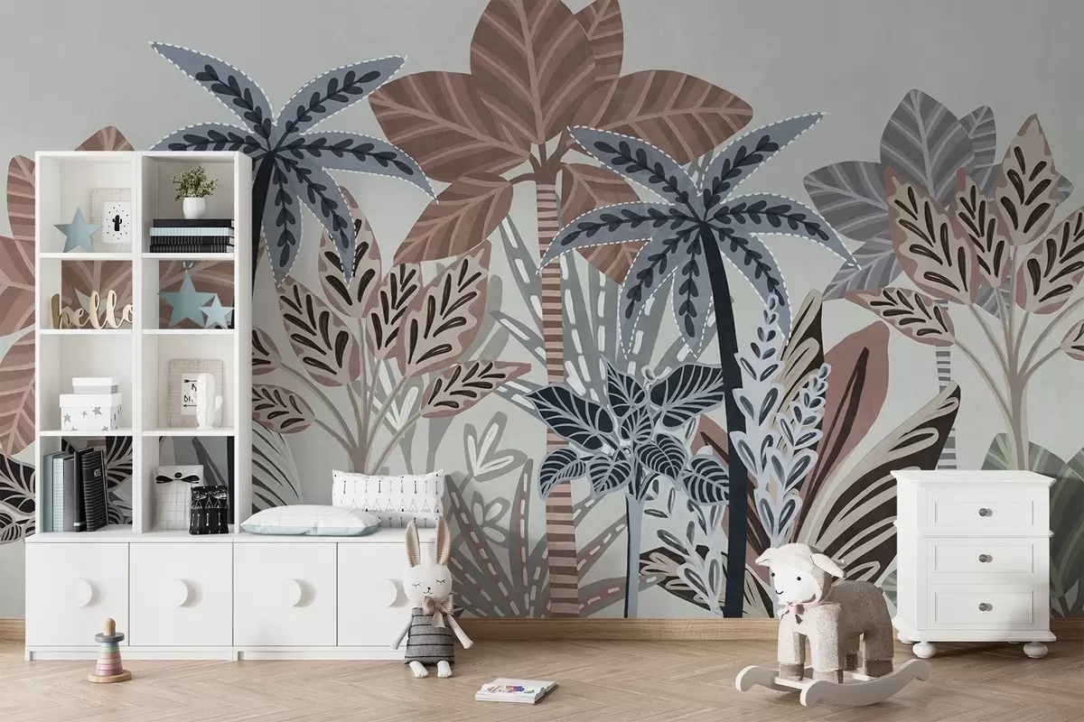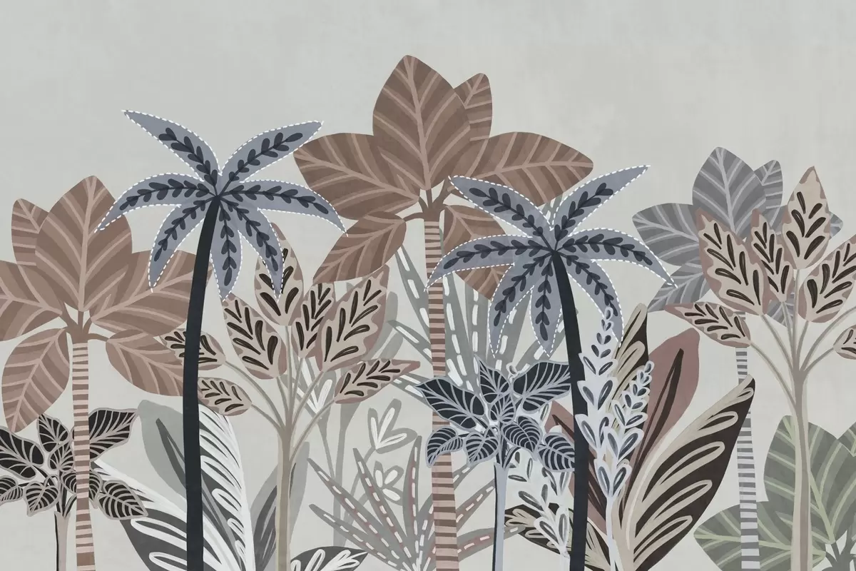 Zidne murale Teksturirane tropske biljke i palme s prigušenim bojama u dekorativnom boho stilu na sivoj pozadini br. w09639v1