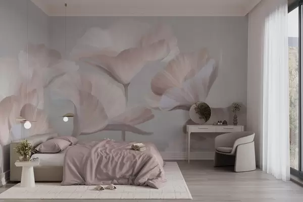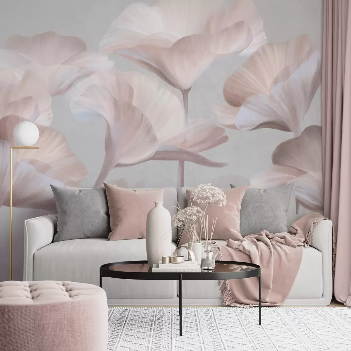 Zidne murale Blijedo breskvasto teksturirani prozirni lotosovi cvjetovi s nježnim laticama na prigušenoj sivoj pozadini br. w09640
