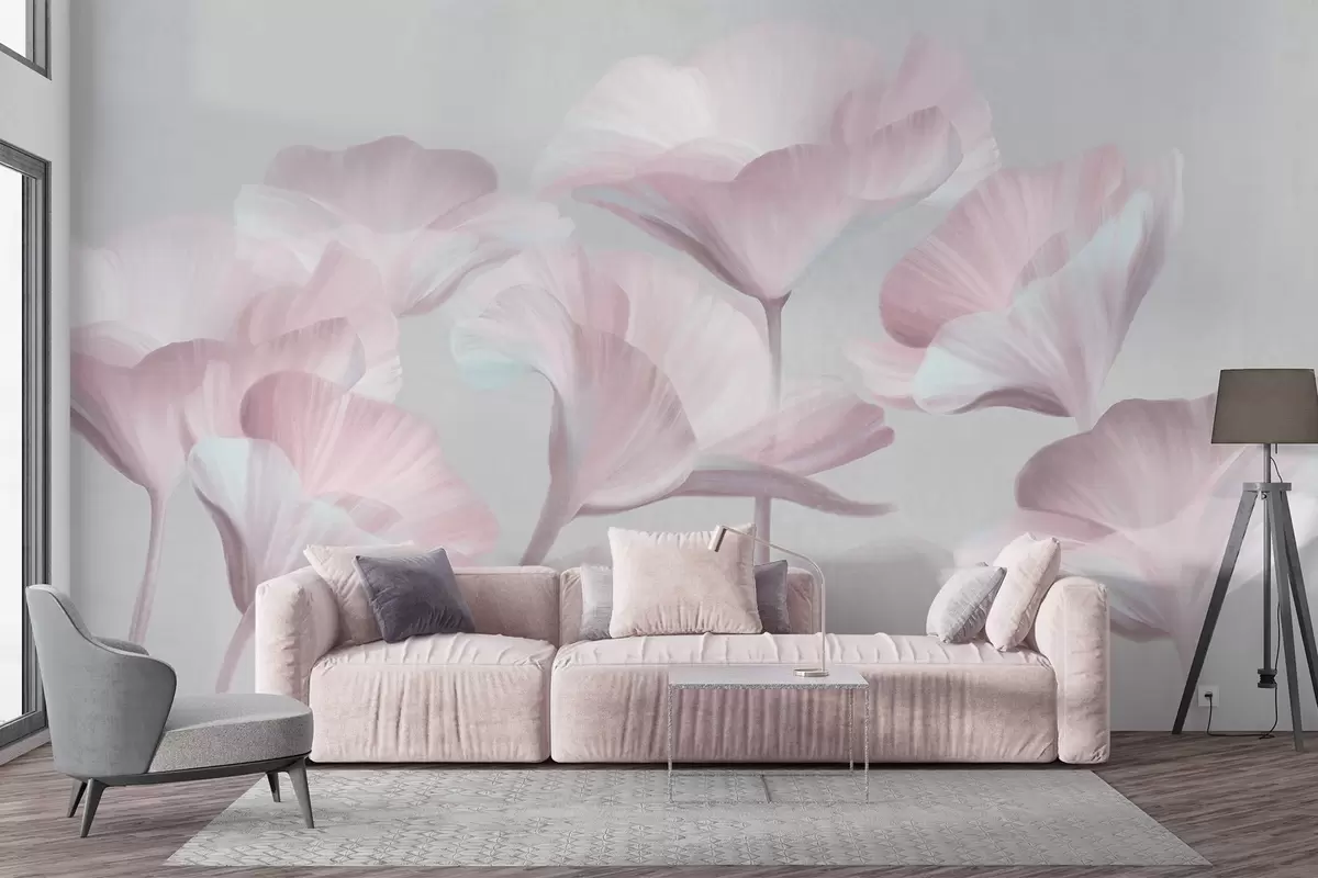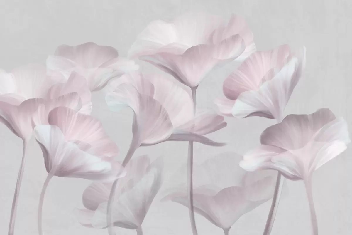 Zidne murale Blijedoružičasti teksturirani prozirni cvjetovi lotosa s nježnim laticama na prigušenoj sivoj pozadini br. w09640v1