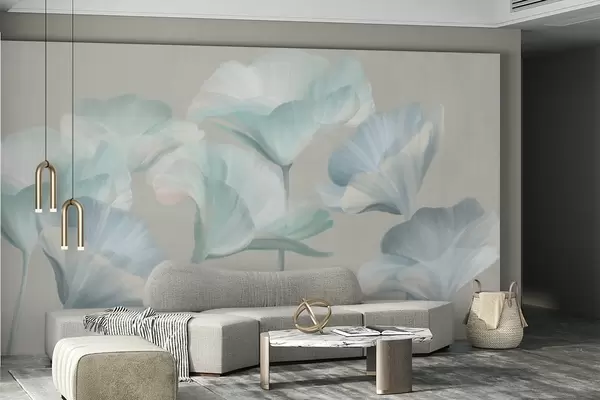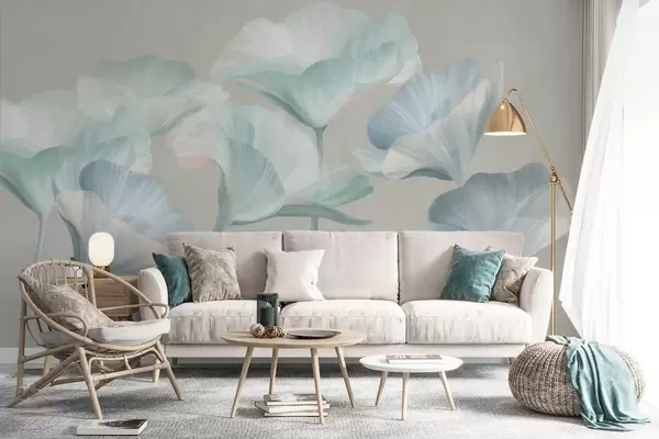 Zidne murale Blijedo tirkizno teksturirani prozirni cvjetovi lotosa s nježnim laticama na prigušenoj sivoj pozadini br. w09640v2