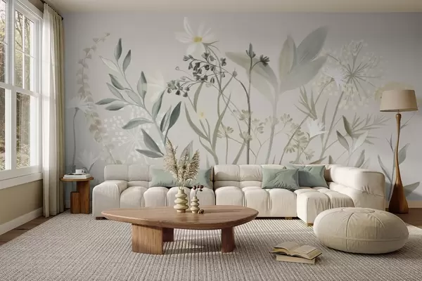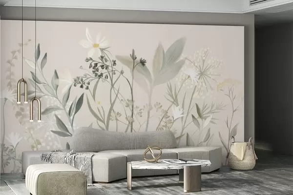 Zidne murale Nježno teksturirano divlje cvijeće i lišće u prigušenim zelenim i krem tonovima na mekoj bež pozadini br. w09641