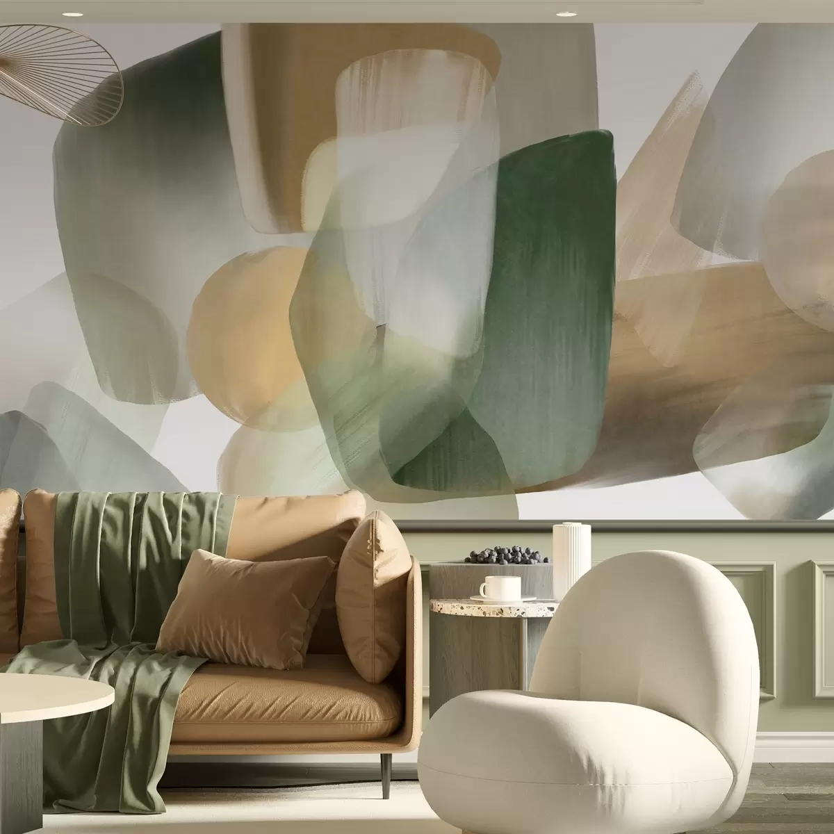 Zidne murale Apstraktni teksturirani oblici u prigušenim zelenim i bež bojama, s mekim rubovima i preklapajućim slojevima br. w09642