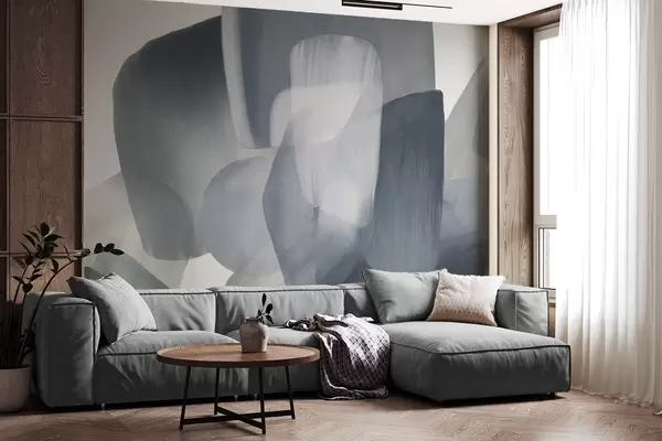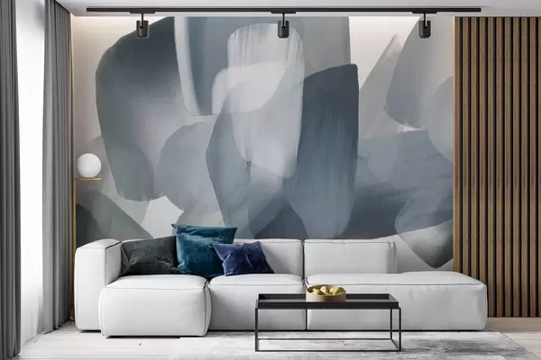 Zidne murale Apstraktni teksturirani oblici u prigušenim plavim i sivim bojama, s mekim rubovima i preklapajućim slojevima br. w09642v1