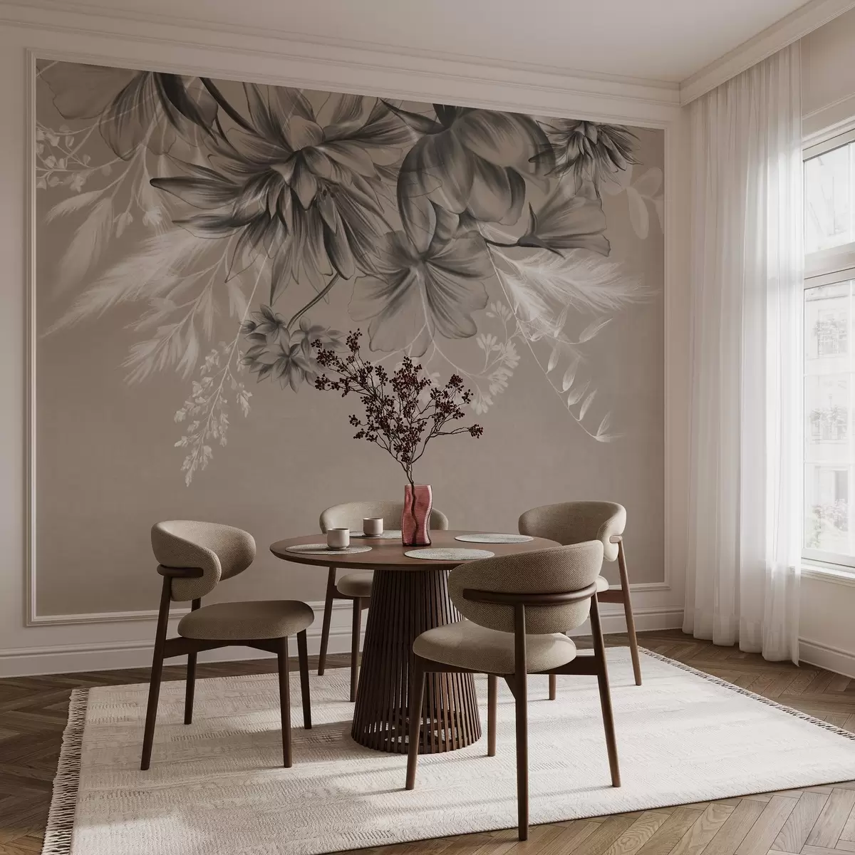 zidne murale Teksturirano cvijeće i paprati u nijansama tamnosive i bijele na prigušenoj bež pozadini u stilu crtanja w09644