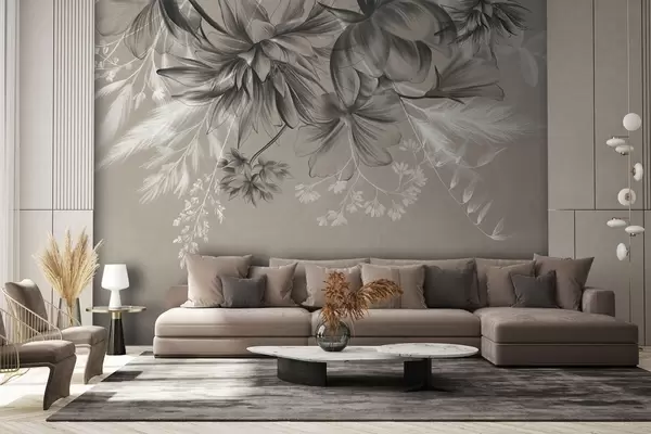 Zidne murale Teksturirano cvijeće i paprati u nijansama tamnosive i bijele na prigušenoj bež pozadini u stilu crtanja br. w09644
