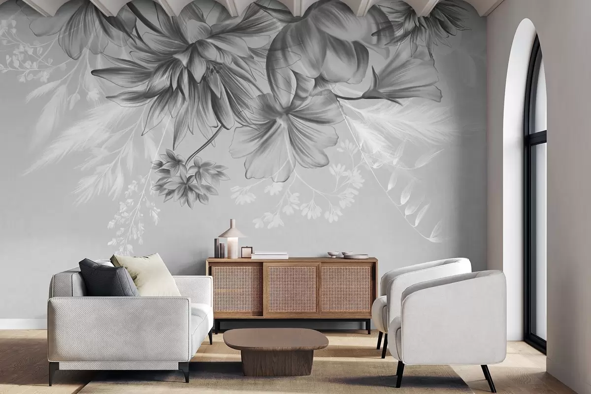 Zidne murale Teksturirano cvijeće i paprati u nijansama tamnosive i bijele na prigušenoj sivoj pozadini u stilu crtanja br. w09644v1
