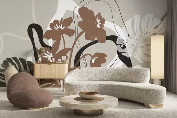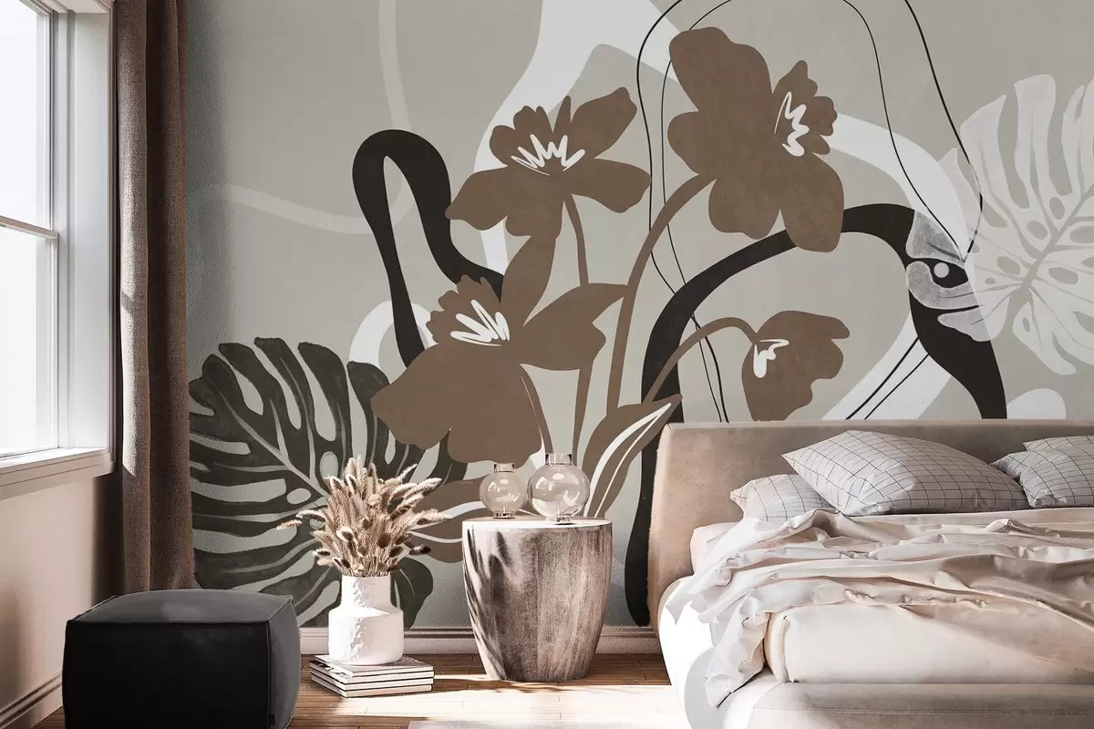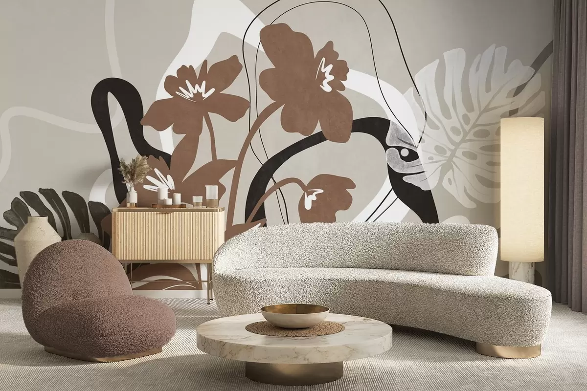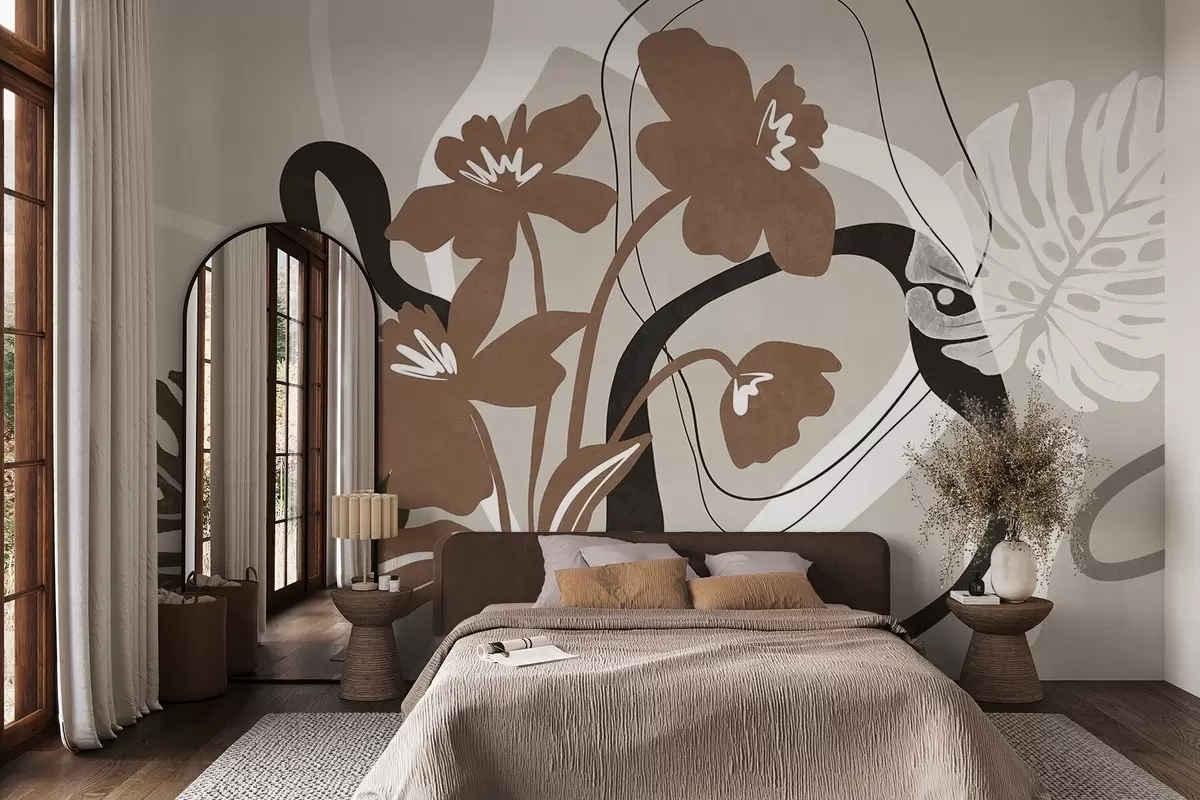 Zidne murale Apstraktno teksturirano smeđe cvijeće s bijelim i crnim oblicima na bež pozadini, minimalistička umjetnost br. w09645v1