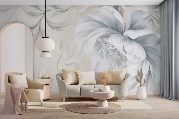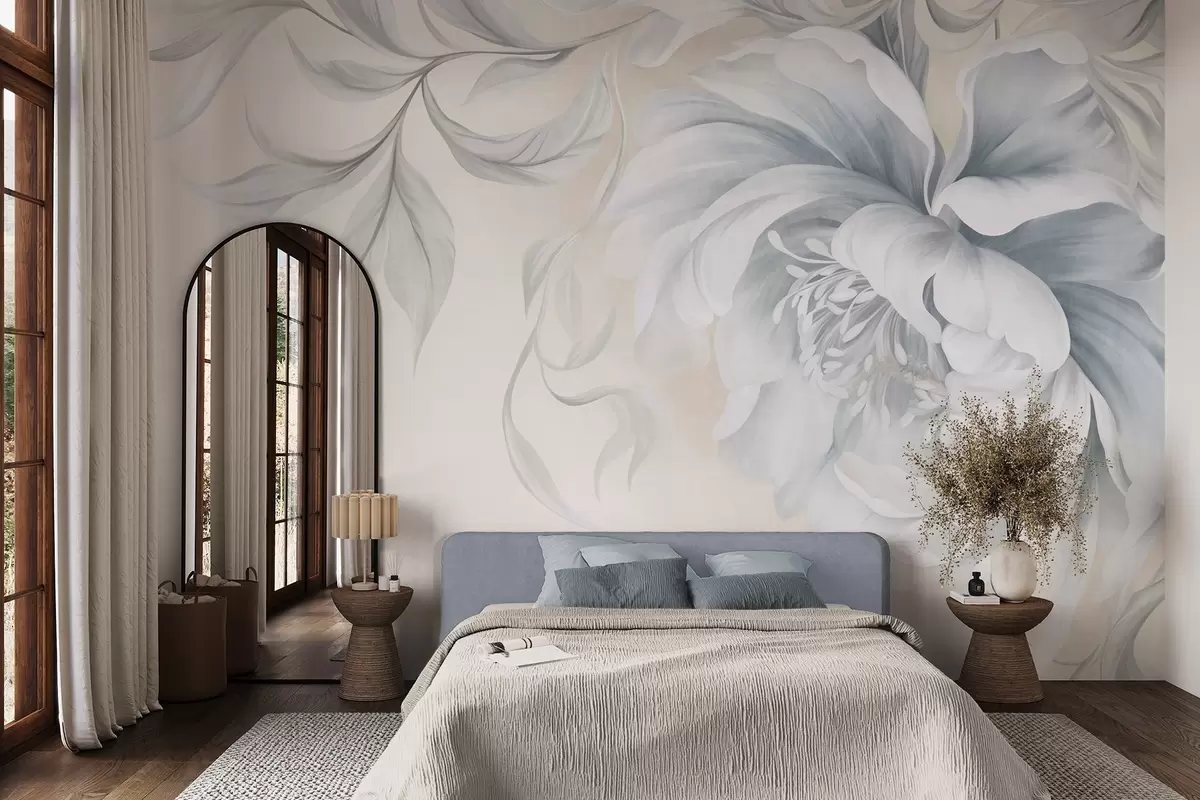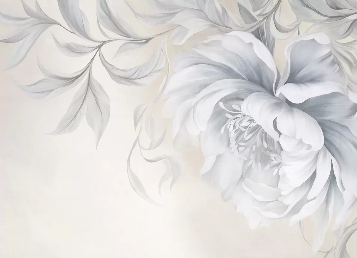 Zidne murale Veliki, teksturirani božur s nježnim laticama i sivim listovima, oslikan u mekom stilu br. w09647