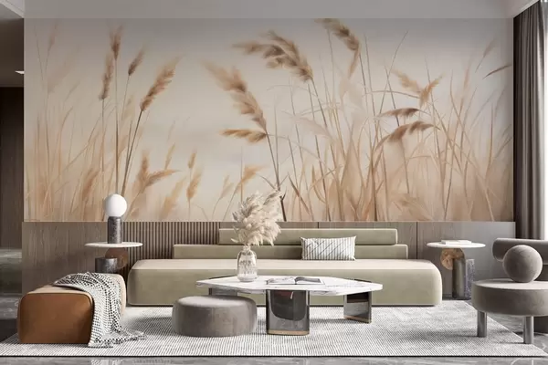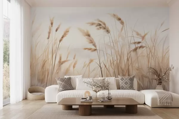 Zidne murale Visoka, teksturirana suha trava s klasjem pšenice u polju na mekoj, blijedoj pozadini br. w09648