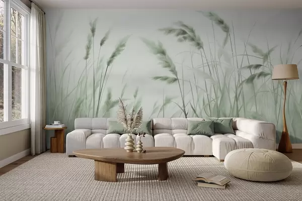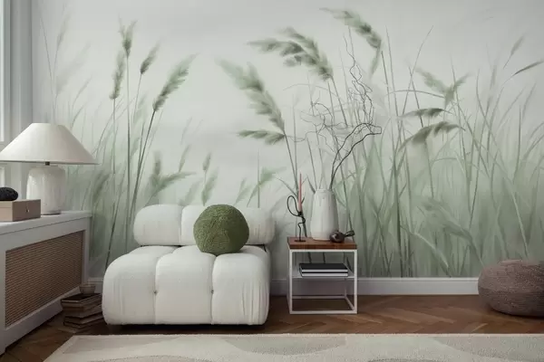 Zidne murale Visoka, teksturirana suha trava s klasjem pšenice u polju na mekoj, blijedoj pozadini br. w09648v1