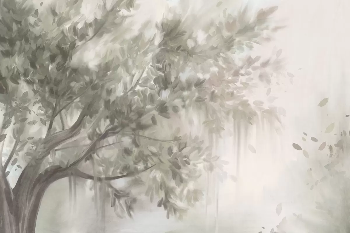 Zidne murale Teksturirano drvo sa svijetlozelenim lišćem i granama, s mekom, maglovitom pozadinom br. w09650