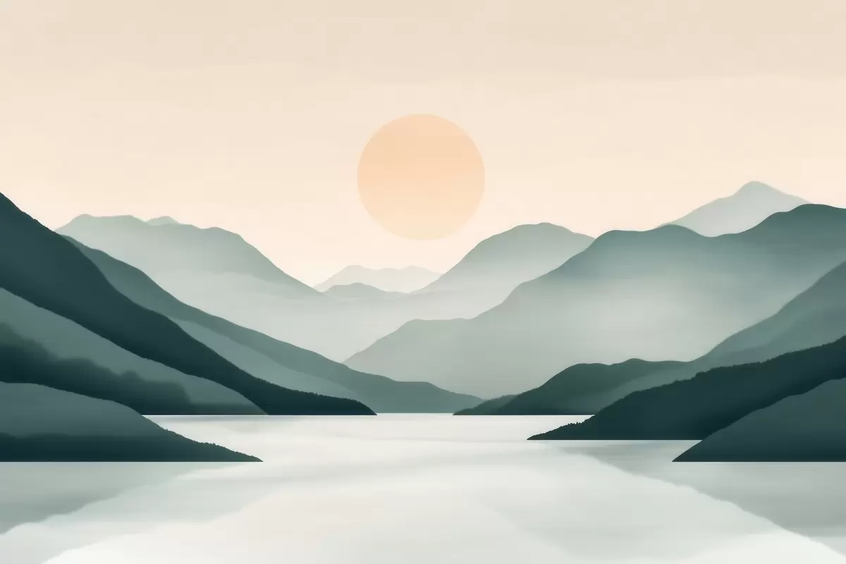 Zidne murale Tihi planinski krajolik sa suncem iznad jezera br. w09735