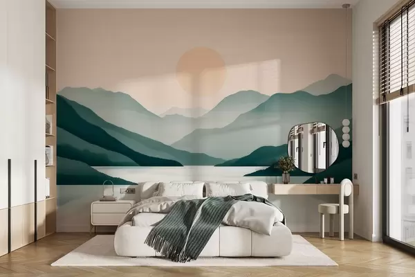Zidne murale Tihi planinski krajolik sa suncem iznad jezera br. w09735