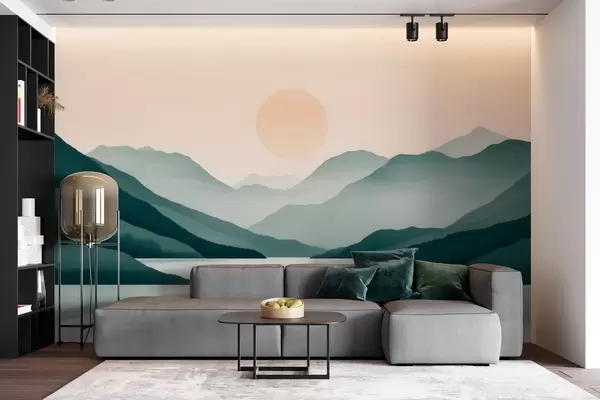 Zidne murale Tihi planinski krajolik sa suncem iznad jezera br. w09735