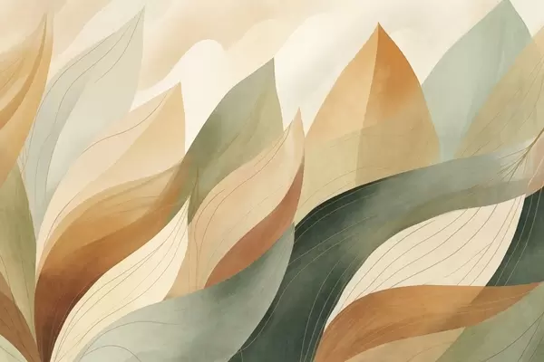 Zidne murale Apstraktno lišće, prigušeni zemljani tonovi zelene, narančaste s nježnim detaljima linija, meka tekstura akvarela br. w09736