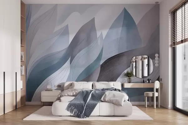 Zidne murale Apstraktno lišće, prigušeni zemljani tonovi plave s nježnim detaljima linija, meka tekstura akvarela br. w09736v1