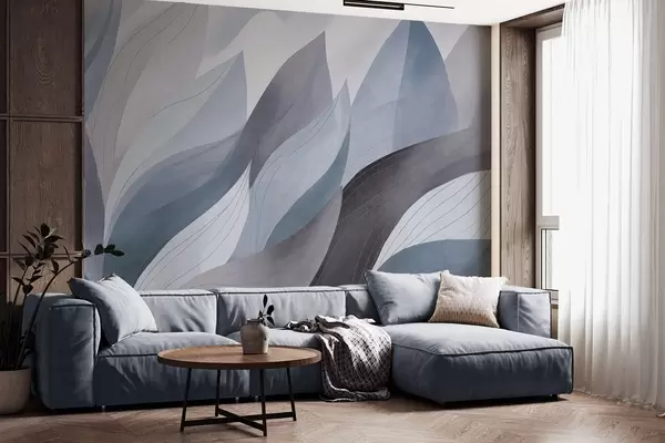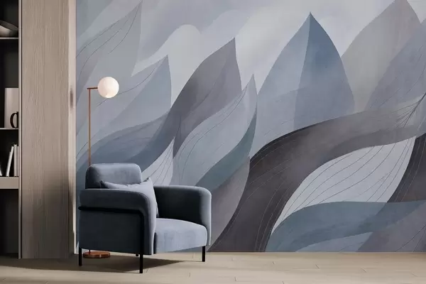 Zidne murale Apstraktno lišće, prigušeni zemljani tonovi plave s nježnim detaljima linija, meka tekstura akvarela br. w09736v1