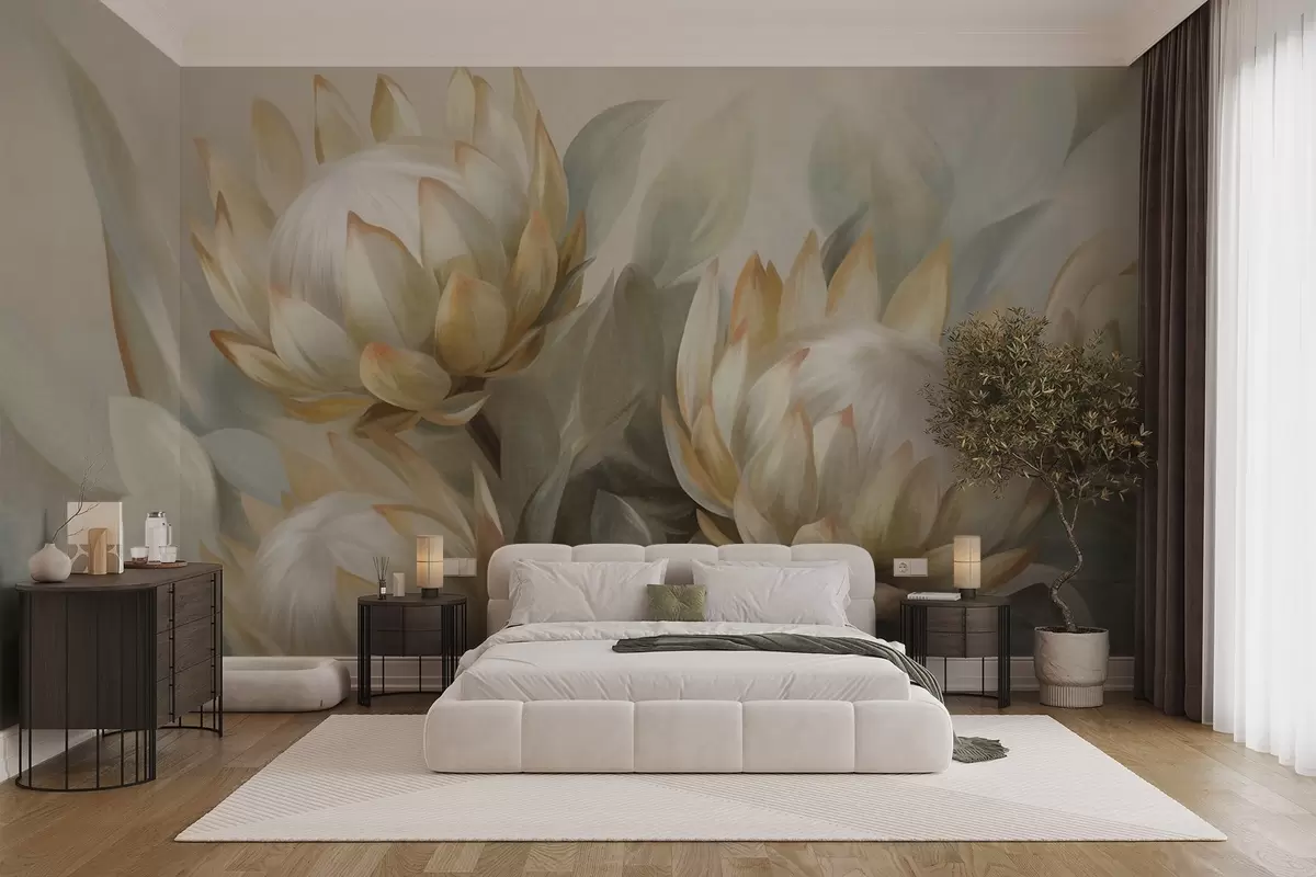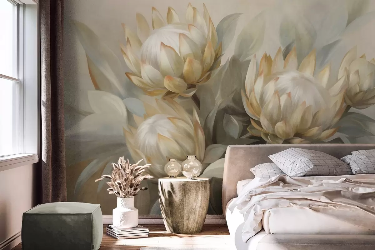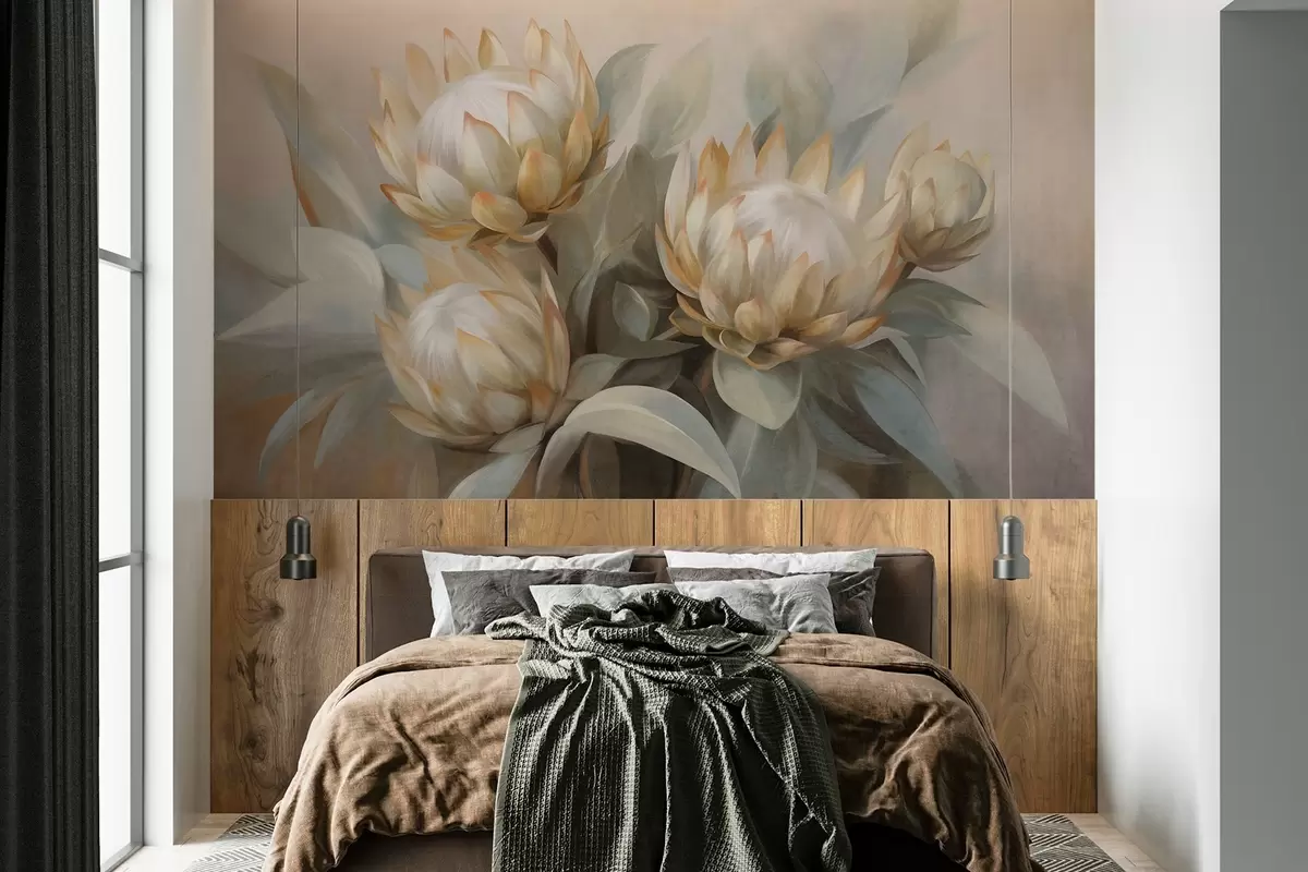 Zidne murale Teksturirani cvjetovi protee sa zelenim lišćem i mekom, zamućenom pozadinom br. w09738
