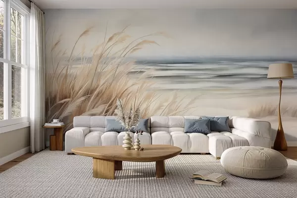 Zidne murale Teksturirani krajolik sa suhom travom na pješčanoj plaži, s oceanom i nebom u pozadini br. w09739