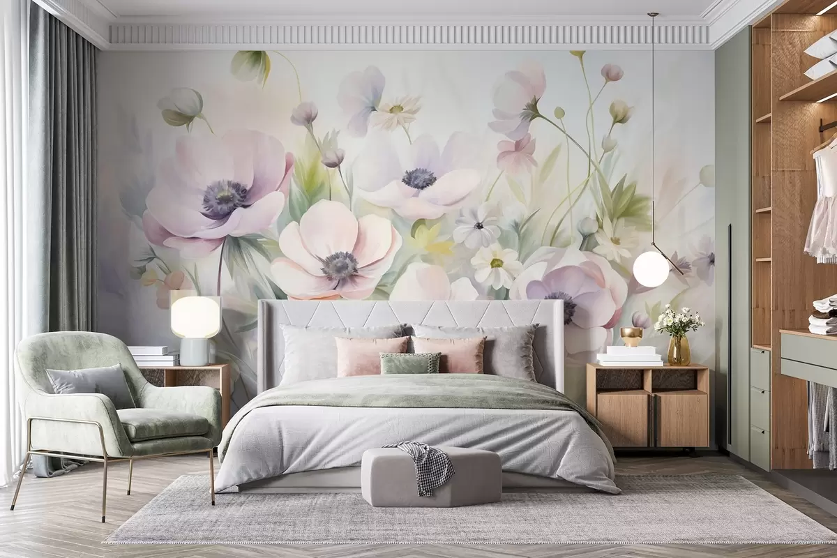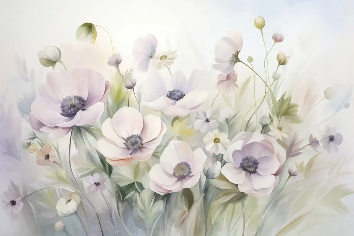 Zidne murale Polje pastelno ružičastih i bijelih cvjetova anemona, zelenog lišća i malih bijelih tratinčica br. w09742